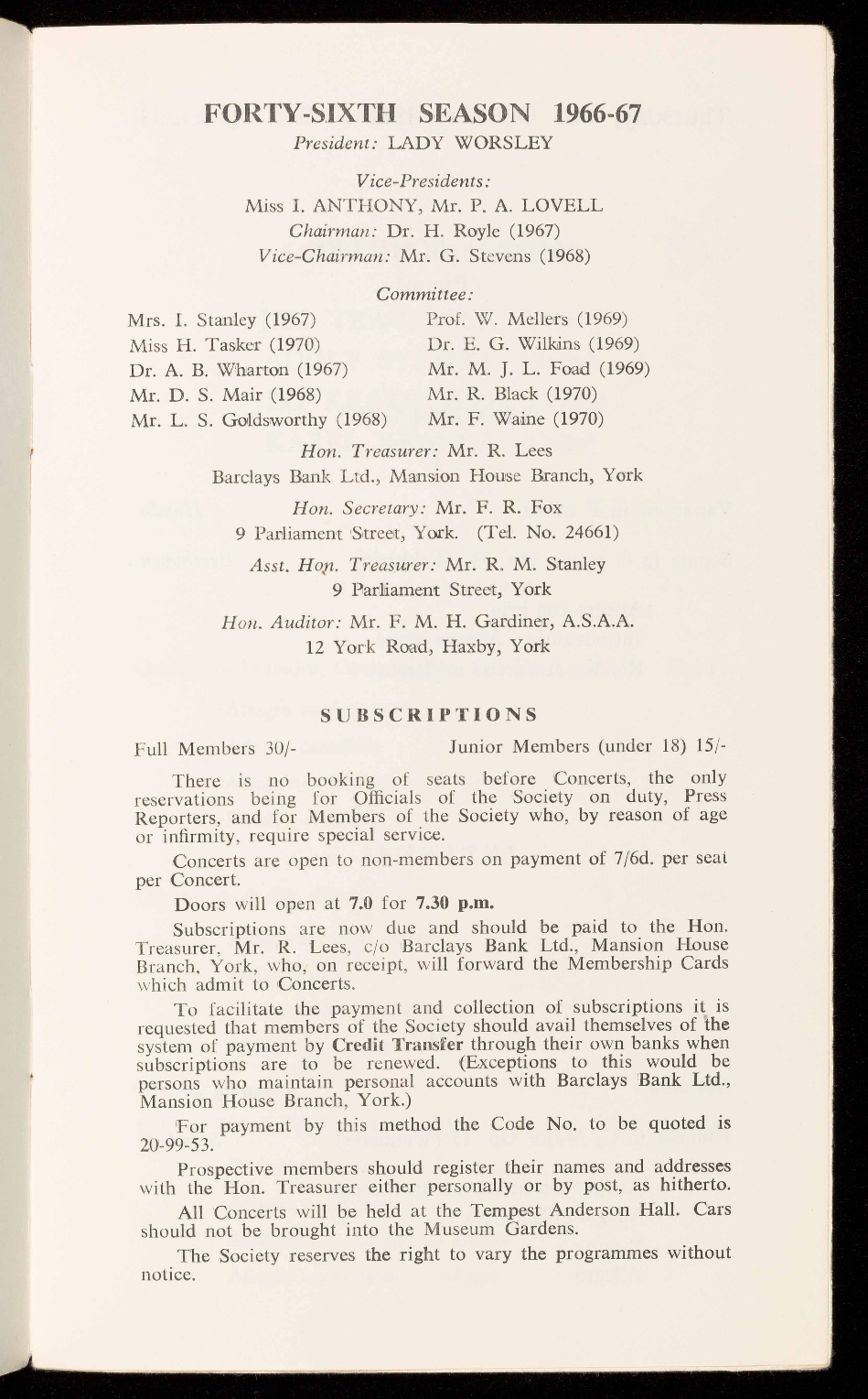 Treasurer, Mr. R. Lees, c/o Barclays Bank Ltd., Mansion House