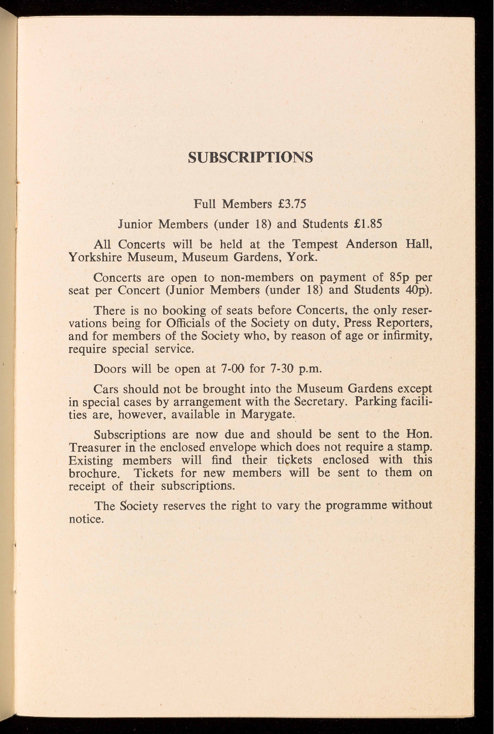 seat per Concert (Junior Members (under 18) and Students 40p).