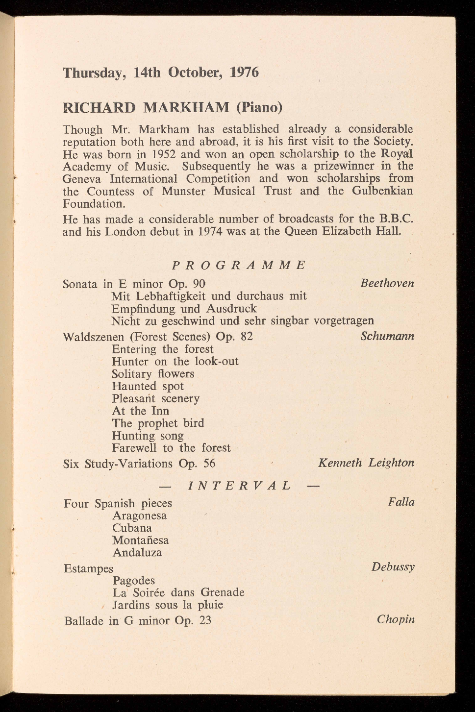 Works by Beethoven, Schumann, Leighton, Debussy