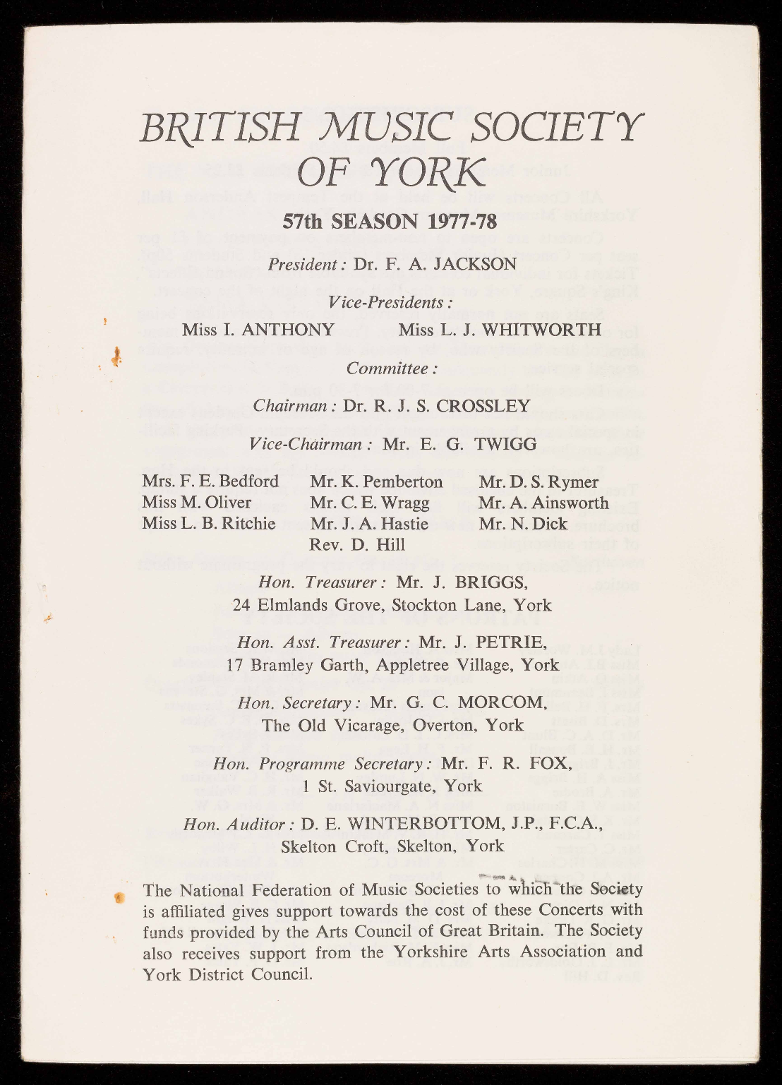 Treasurer, J. Briggs, 24 Elmlands Grove, Stockton Lane, York.