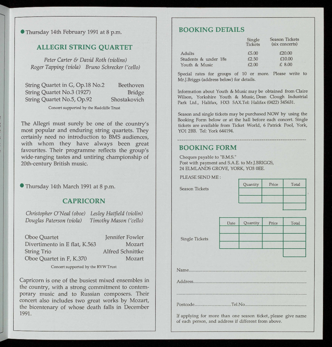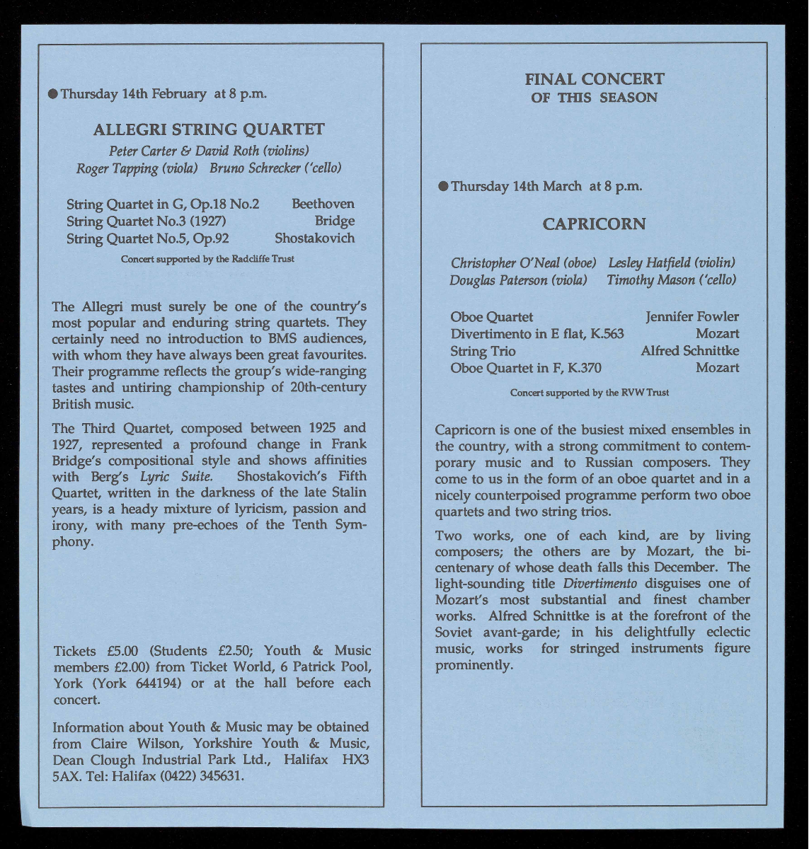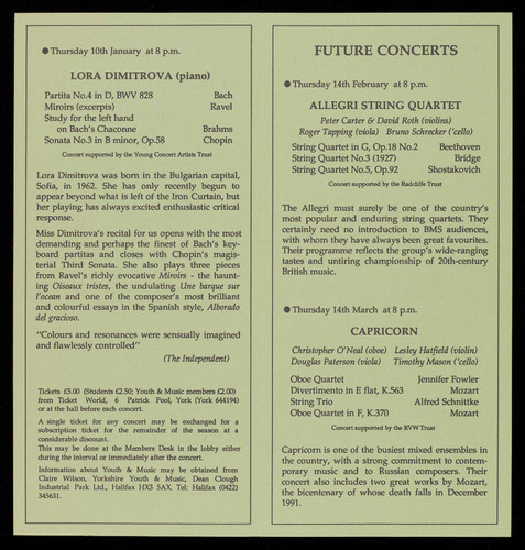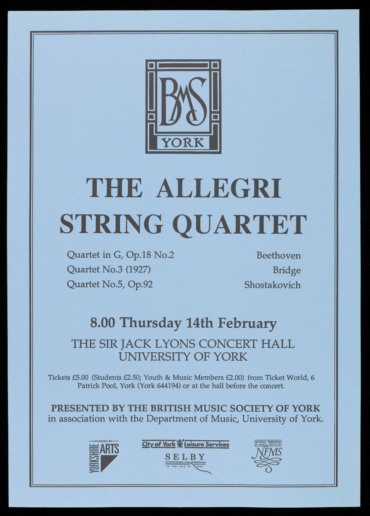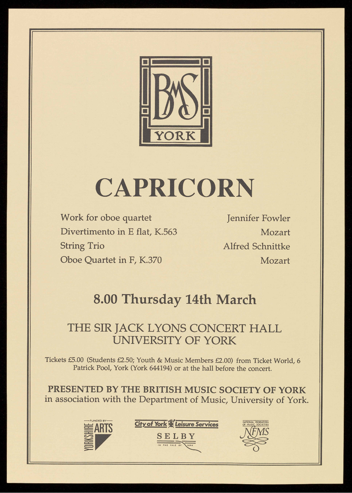 Tickets £5.00 (Students £2.50; Youth & Music Members £2.00) from Ticket World, 6