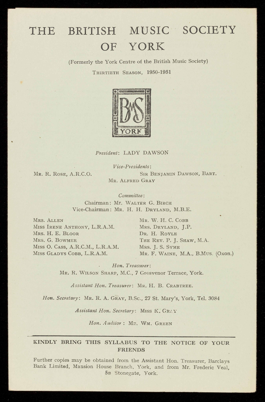 Hon. Secretary: MR. R. A. GRAY, B.Sc., 27 St. Mary's, York, Tel. 3084