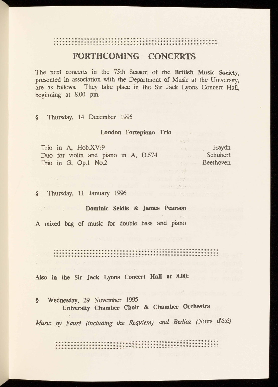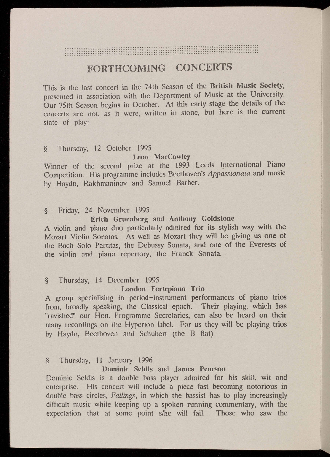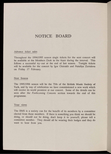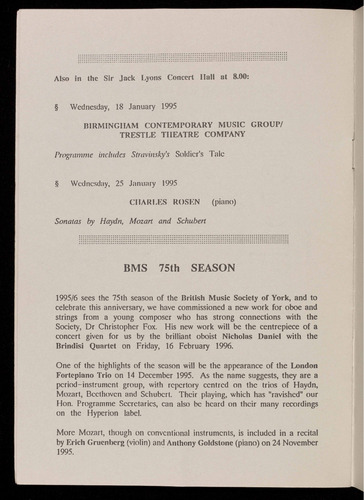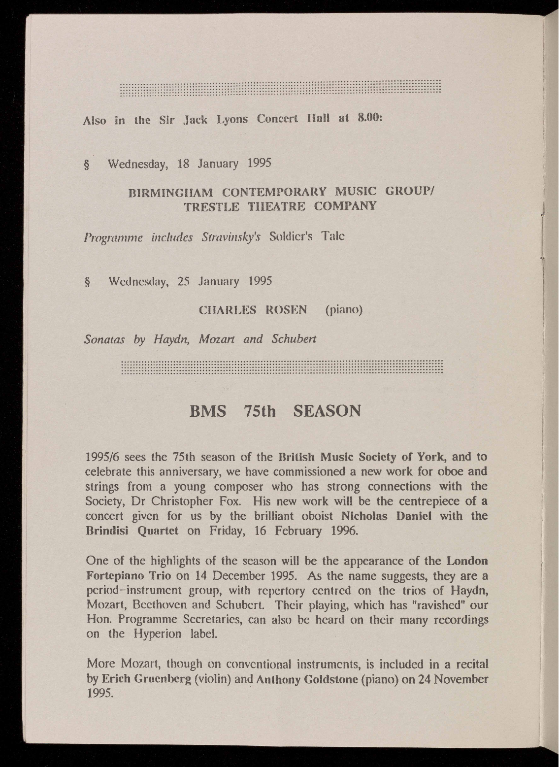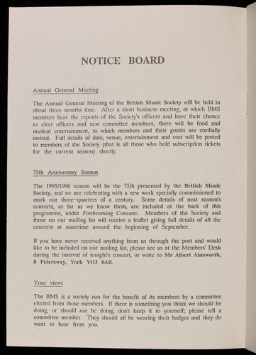 The 1995/1996 season will be the 75th of the British Music Society of