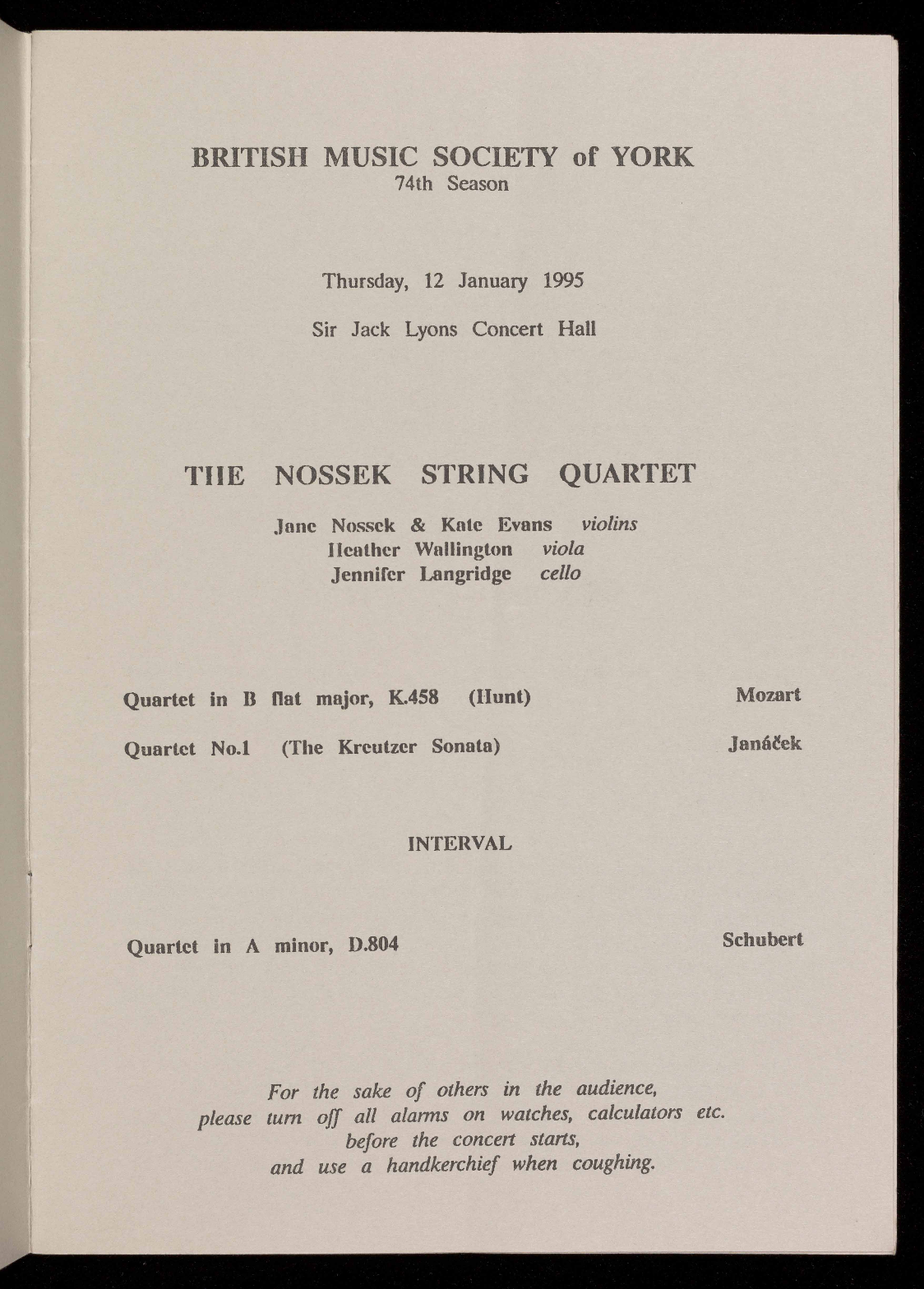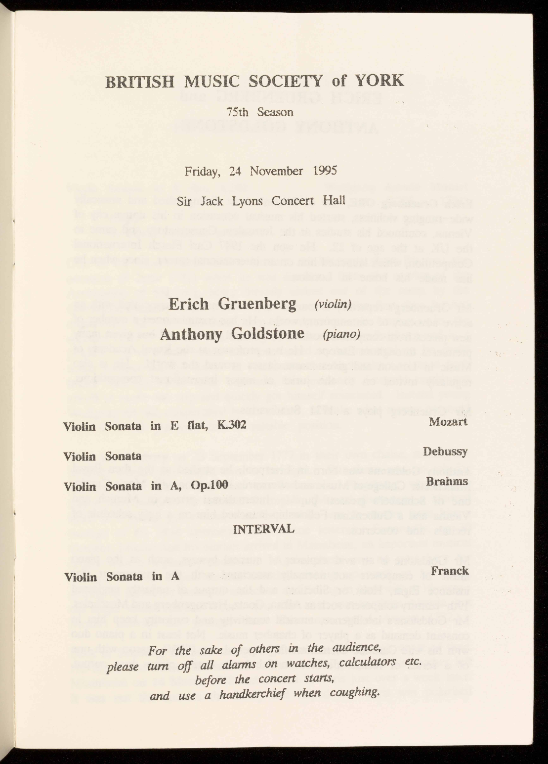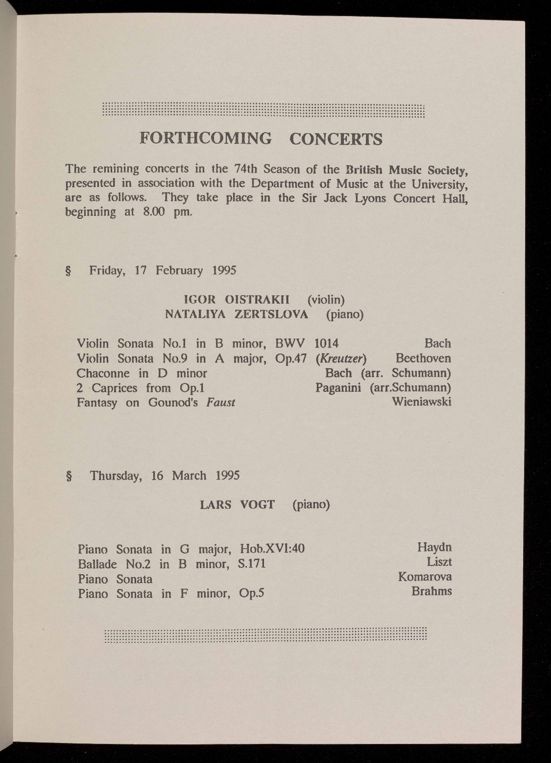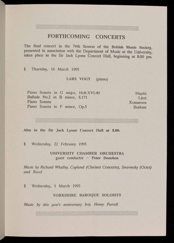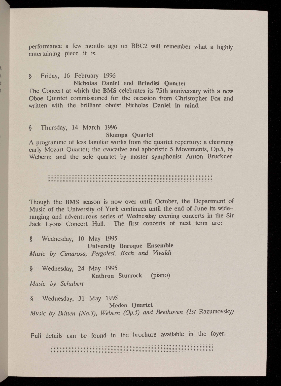 The 1995/1996 season will be the 75th of the British Music Society of