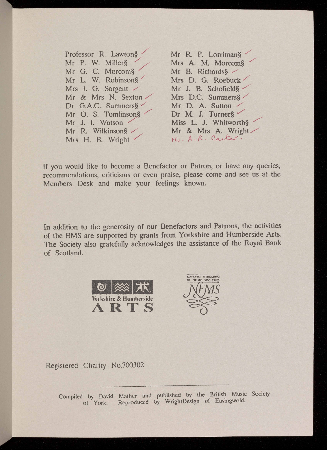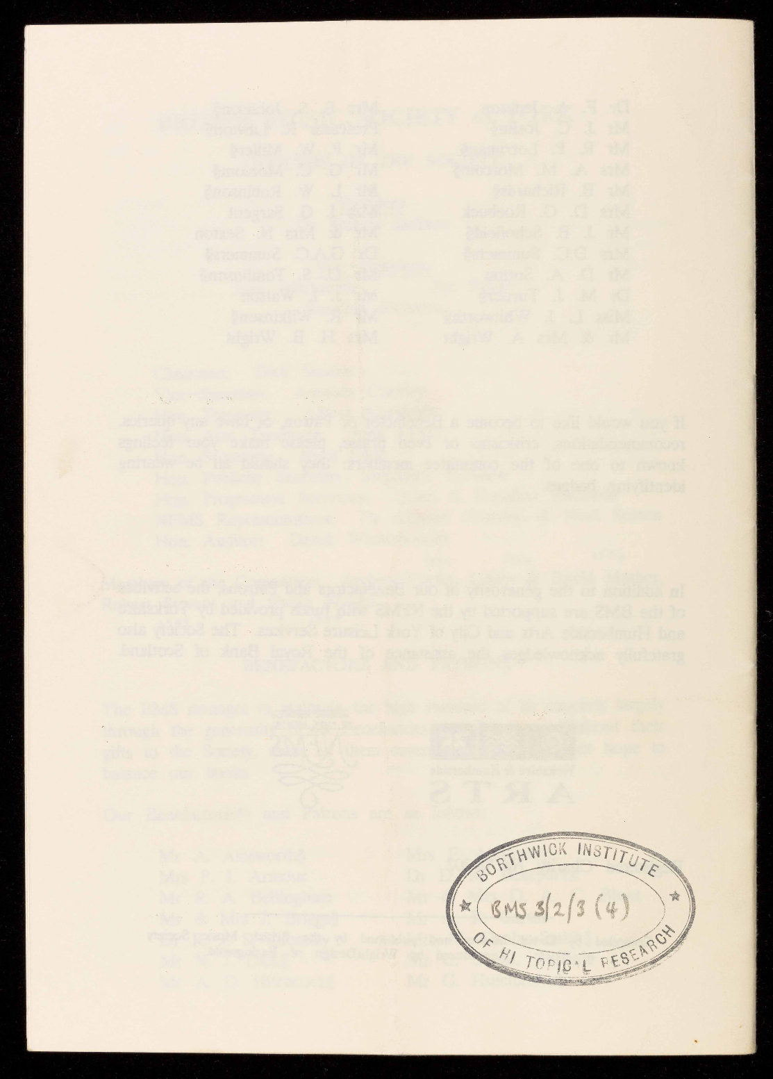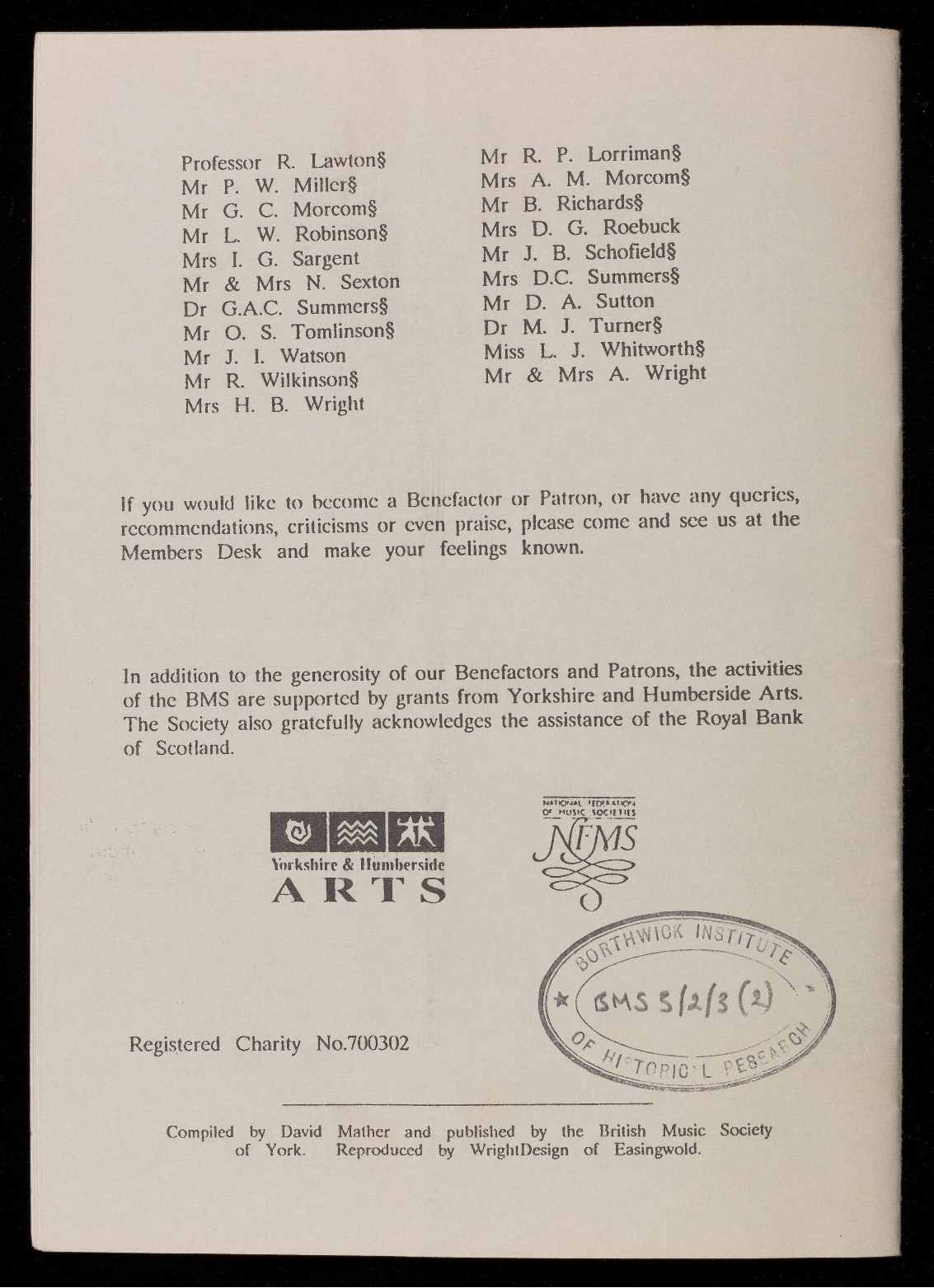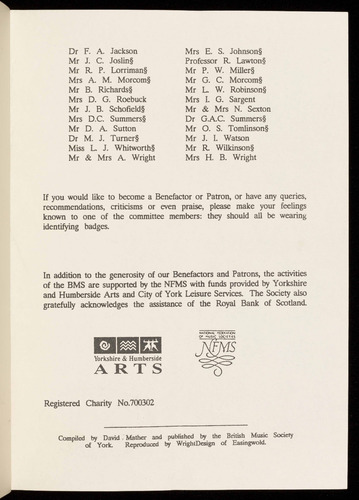 and Humberside Arts and City of York Leisure Services. The Society also