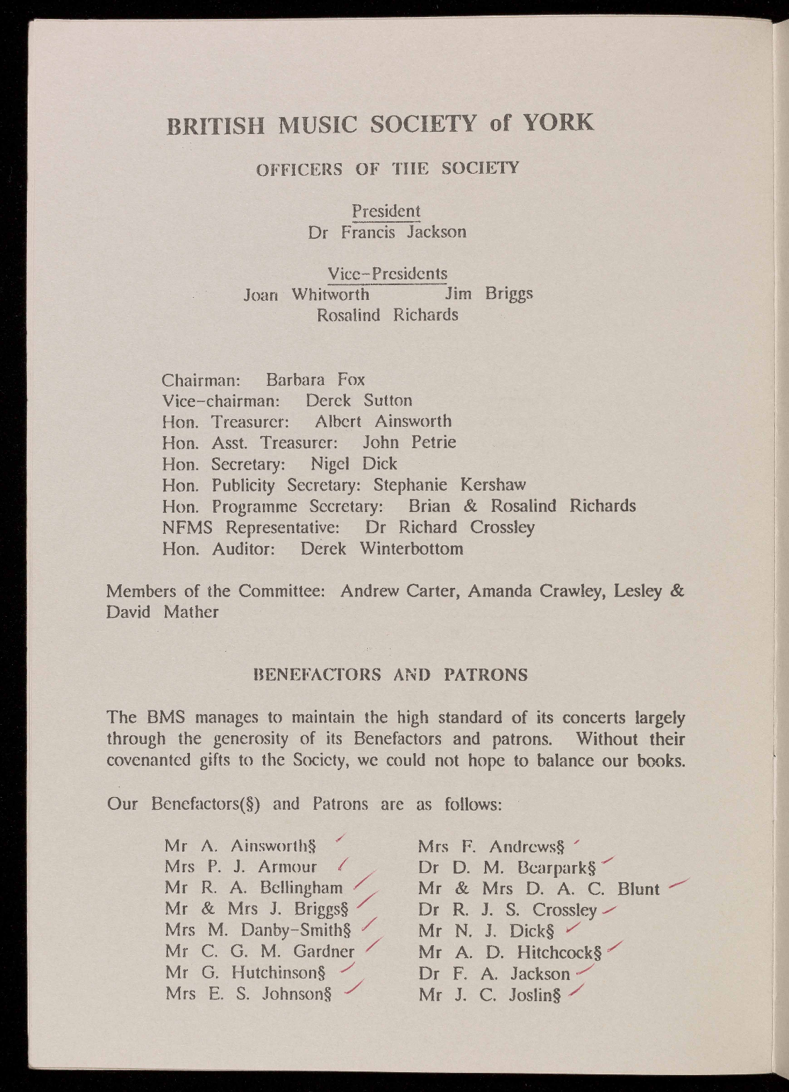 Our Benefactors (§) and Patrons are as follows: