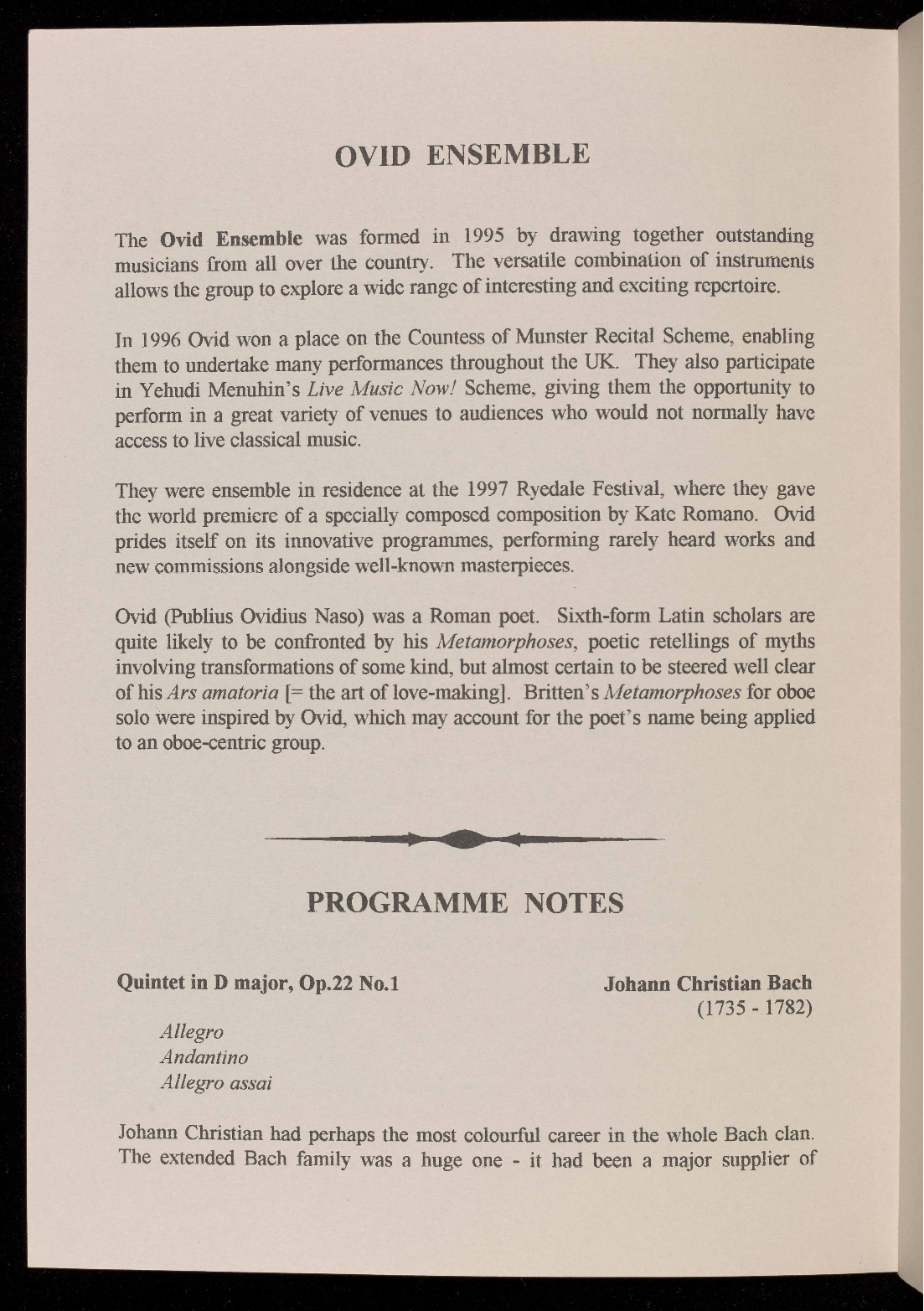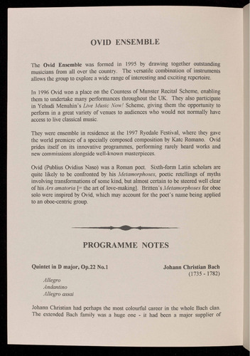 The Ovid Ensemble was formed in 1995 by drawing together outstanding