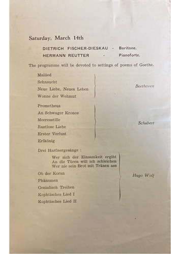 The programme will be devoted to settings of poems of Goethe.