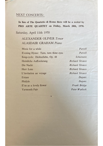In lieu of The Quartetto di Roma there will be a recital by