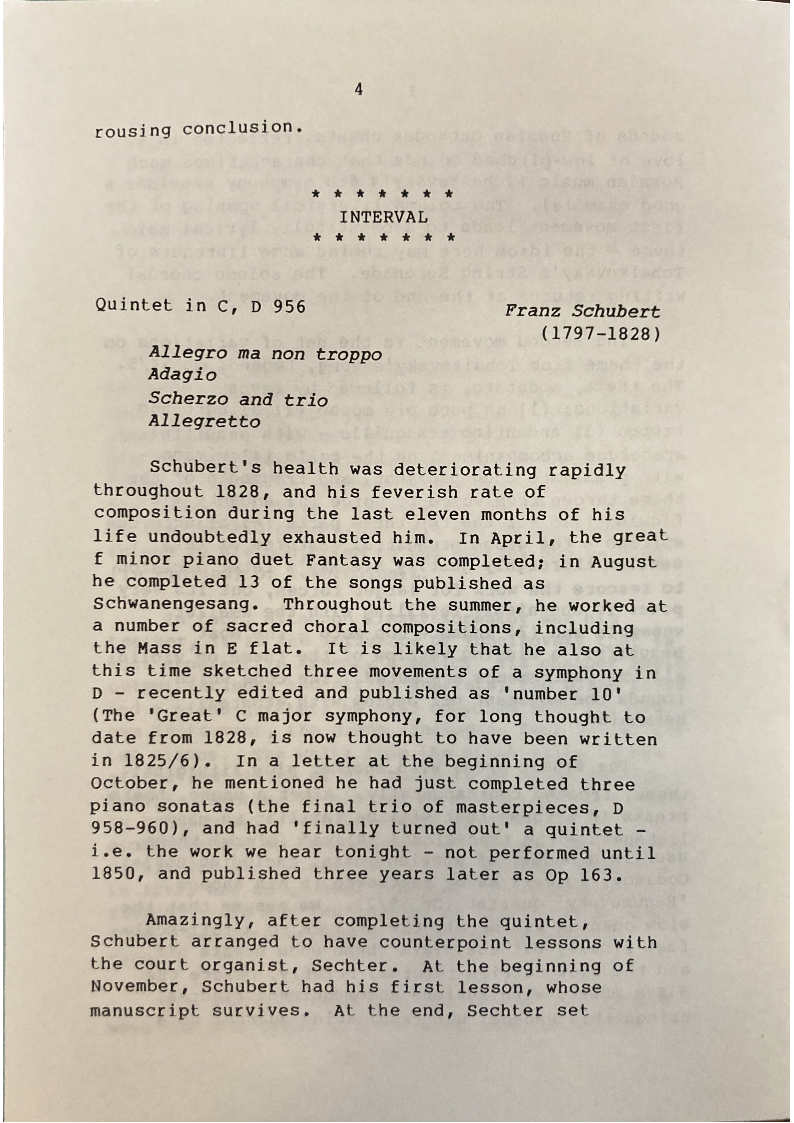 output includes two string quartets, two piano trios