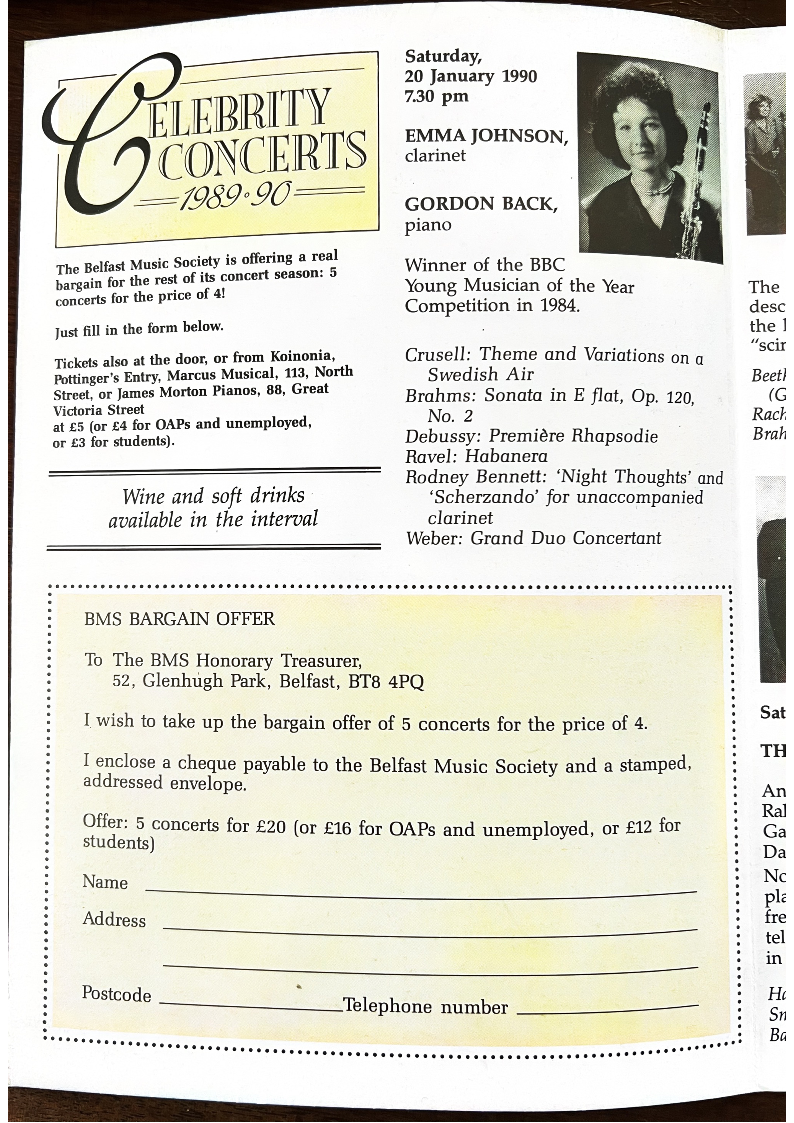 I enclose a cheque payable to the Belfast Music Society and a stamped,