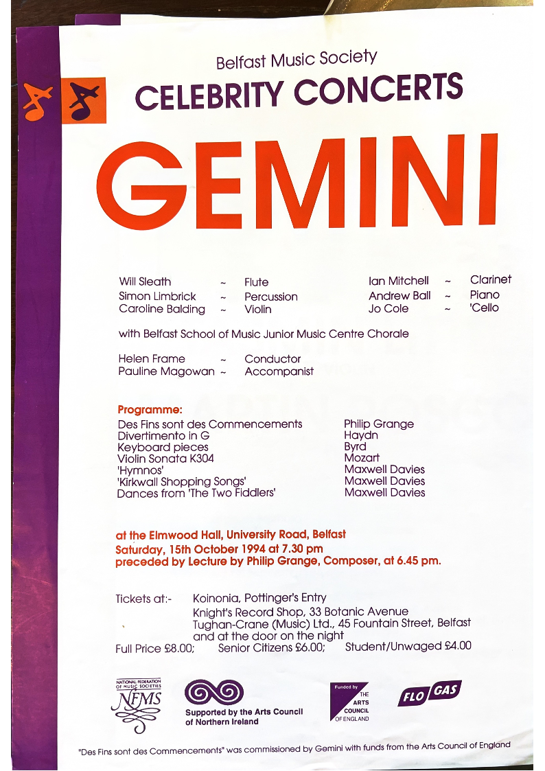 "Des Fins sont des Commencements" was commissioned by Gemini with funds from the Arts Council of England