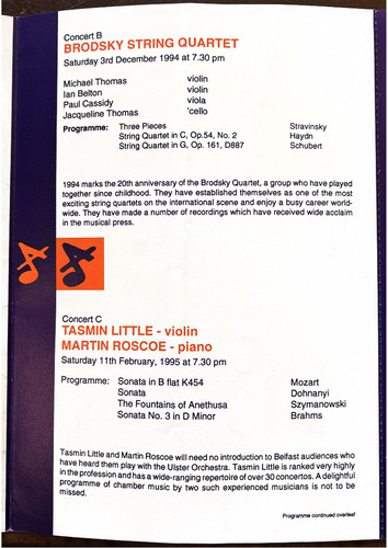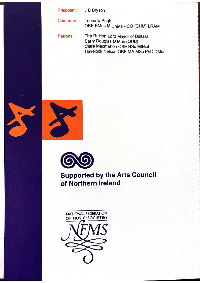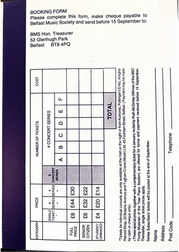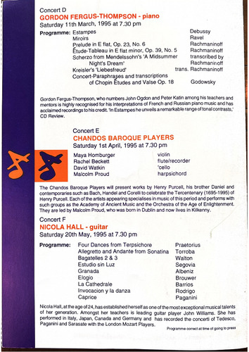 "Tickets for individual concerts are only available at the Hall on the night or from Koinonia, Pottinger's Entry, Knights