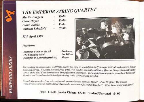 Tickets for the five concerts in the Elmwood Hall will also be available at the hall on the evening of the performance