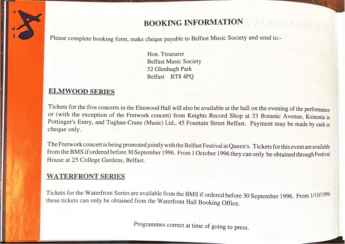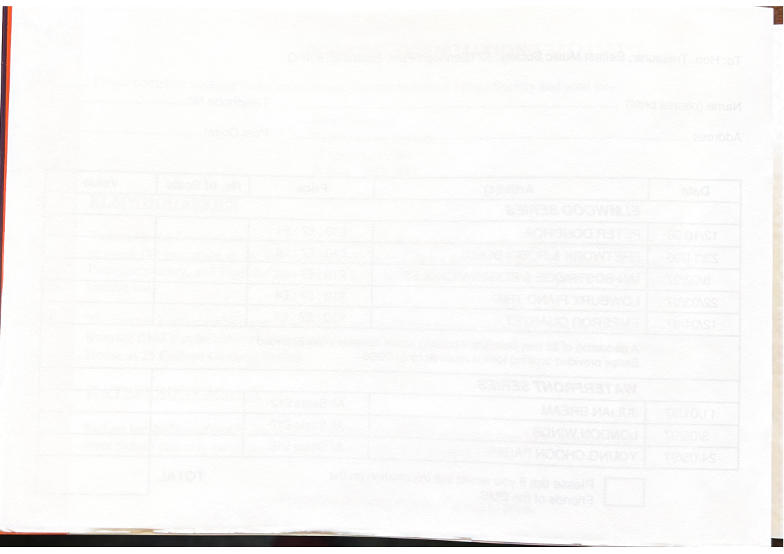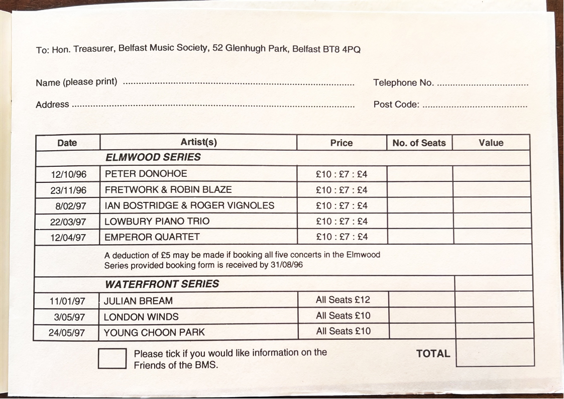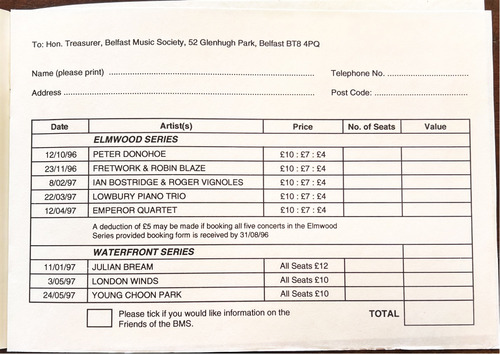 Please complete booking form, make cheque payable to Belfast Music Society and send to:-