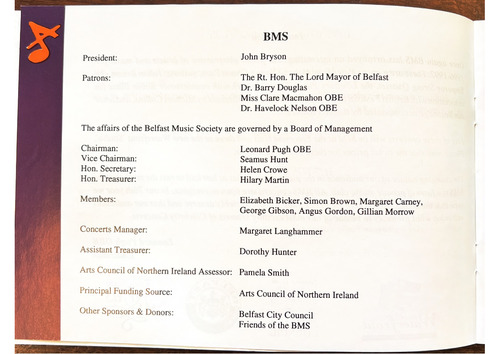 The affairs of the Belfast Music Society are governed by a Board of Management