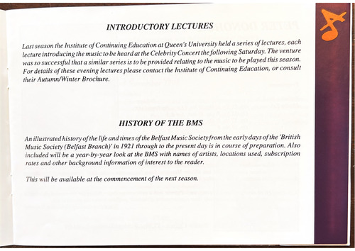 Music Society (Belfast Branch)' in 1921 through to the present day is in course of preparation. Also