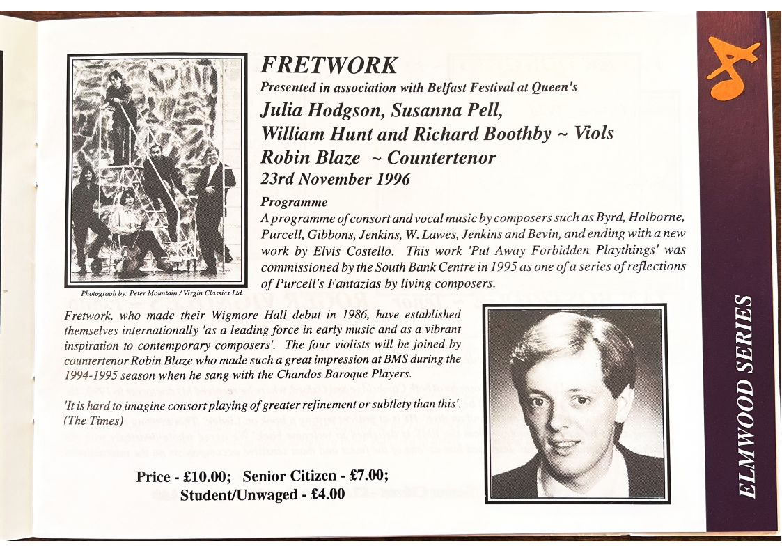 The Fretwork concert is being promoted jointly with the Belfast Festival at Queen's. Tickets for this event are available