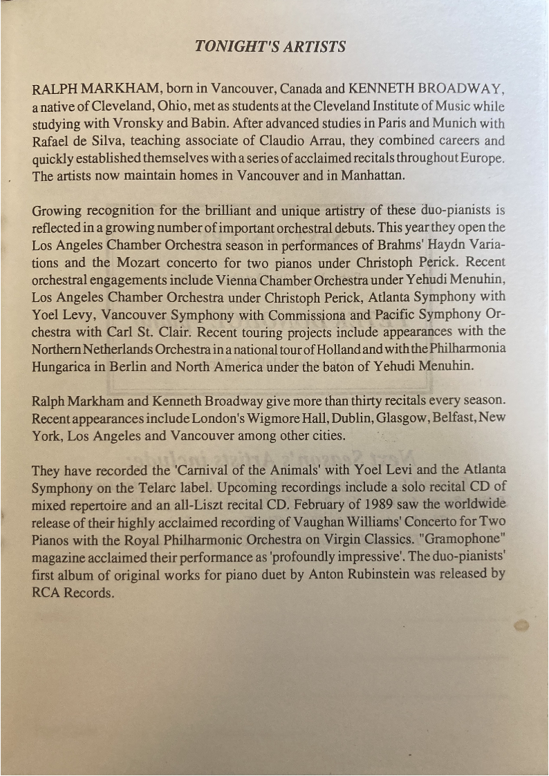 Ralph Markham and Kenneth Broadway give more than thirty recitals every season.