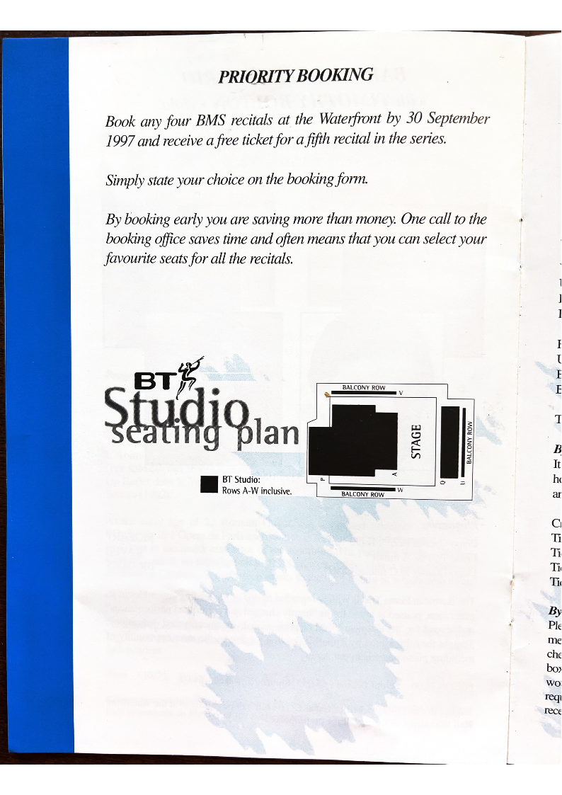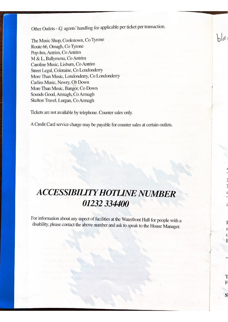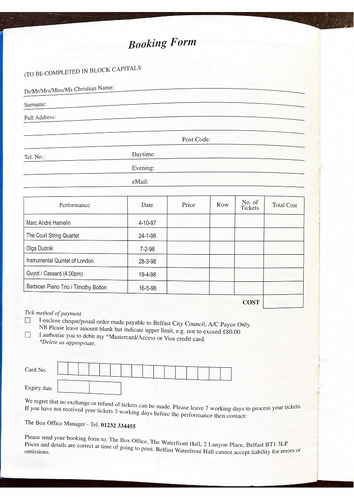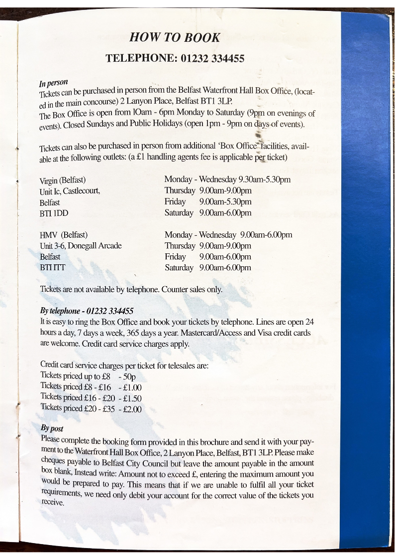 Please send your booking form to: The Box Office, The Waterfront Hall, 2 Lanyon Place, Belfast BTI 3LP.