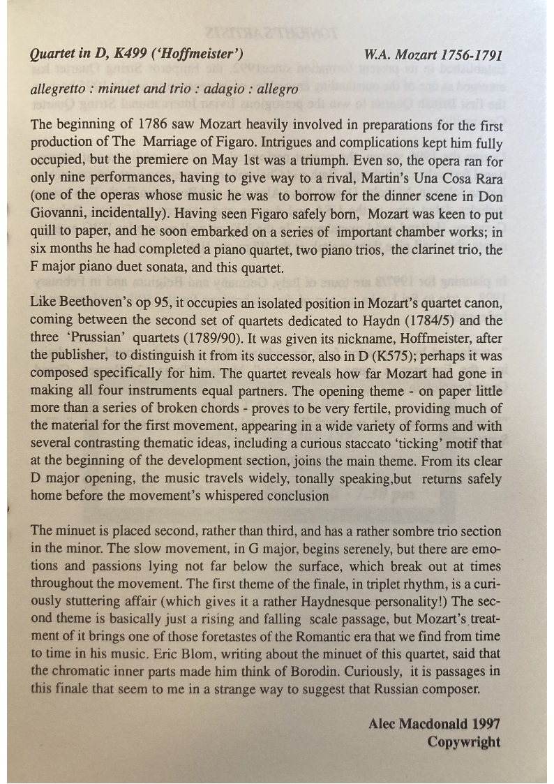 three 'Prussian' quartets (1789/90). It was given its nickname, Hoffmeister, after