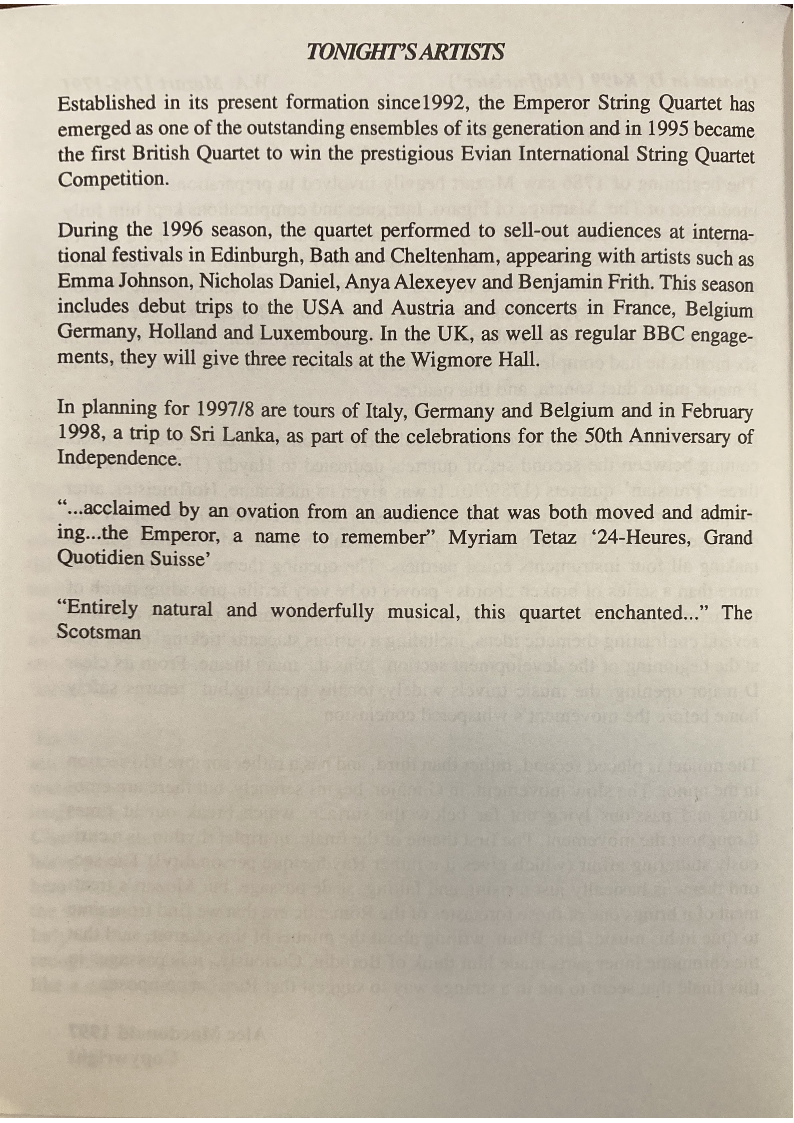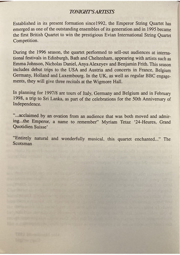 Established in its present formation since 1992, the Emperor String Quartet has