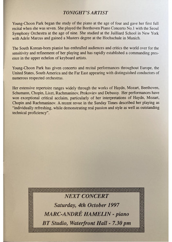 Young-Choon Park has given concerto and recital performances throughout Europe, the