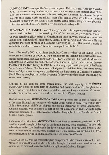 they range from courtly love songs to light-hearted comic pieces. Tonight's example, a six-