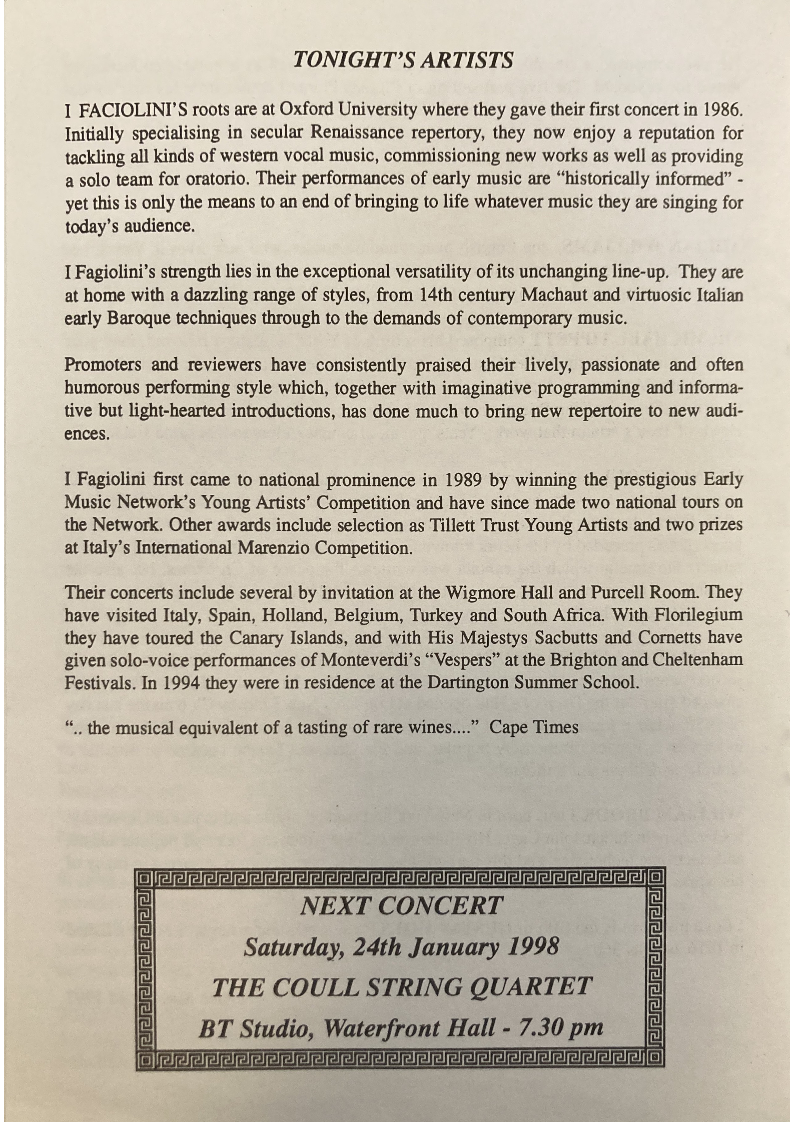 I Fagiolini first came to national prominence in 1989 by winning the prestigious Early