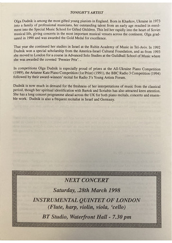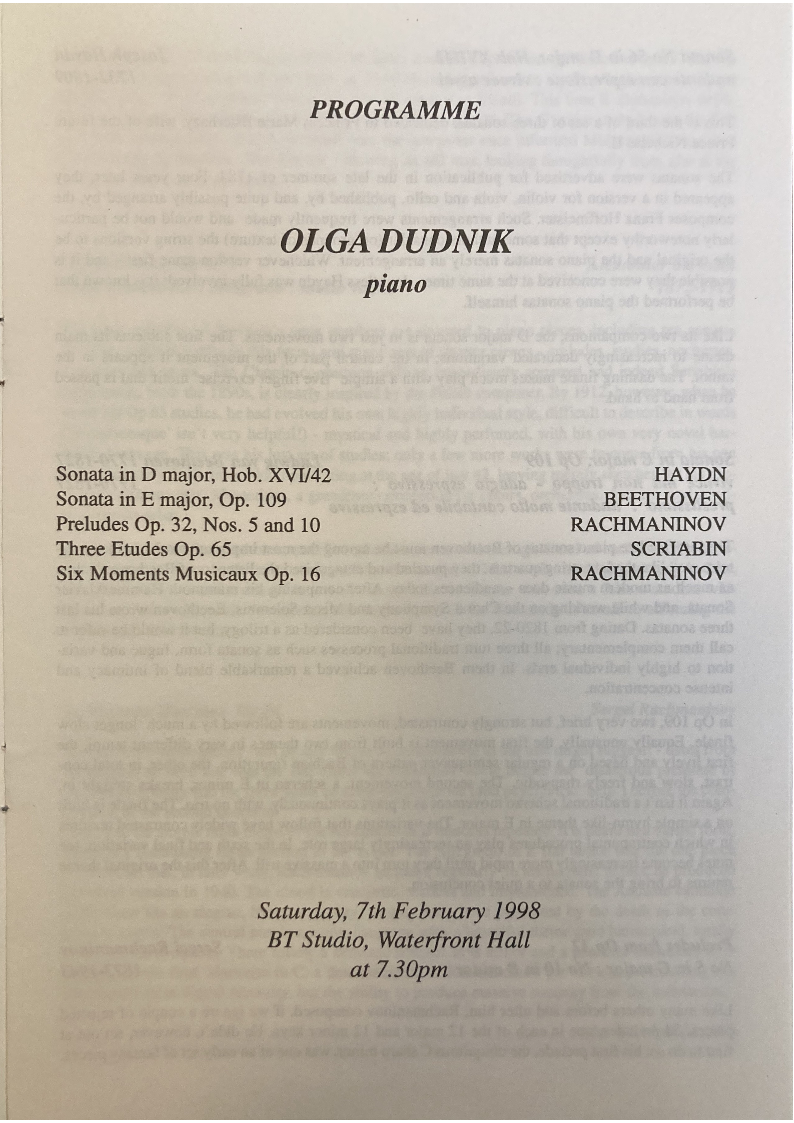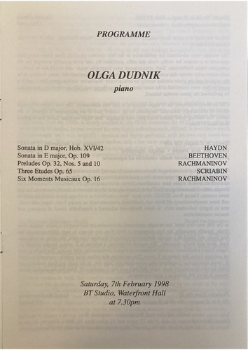 Olga Dudnik is among the most gifted young pianists in England. Born in Kharkov, Ukraine in 1973