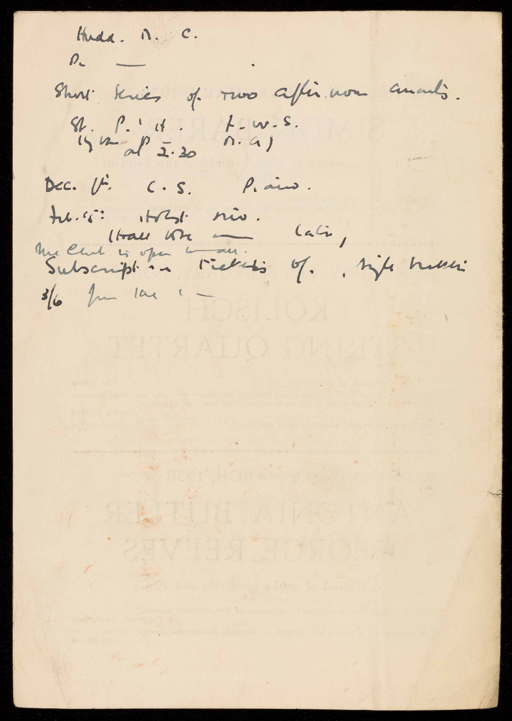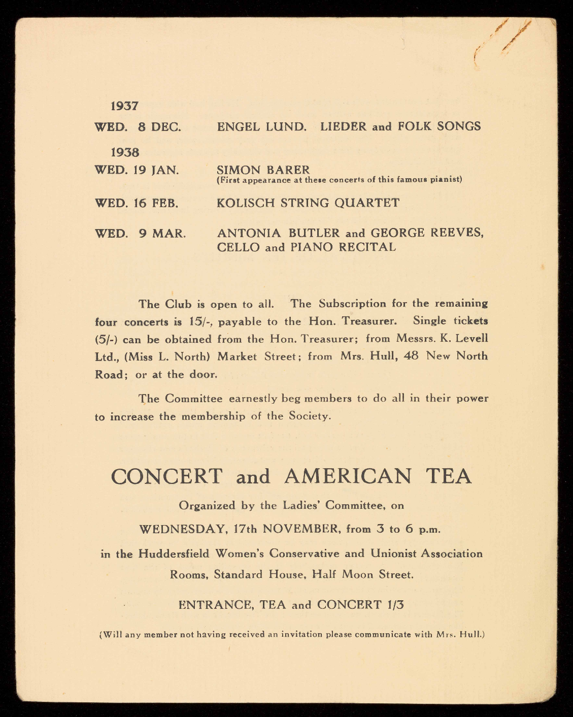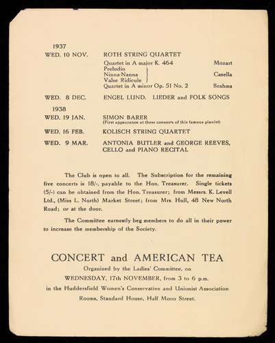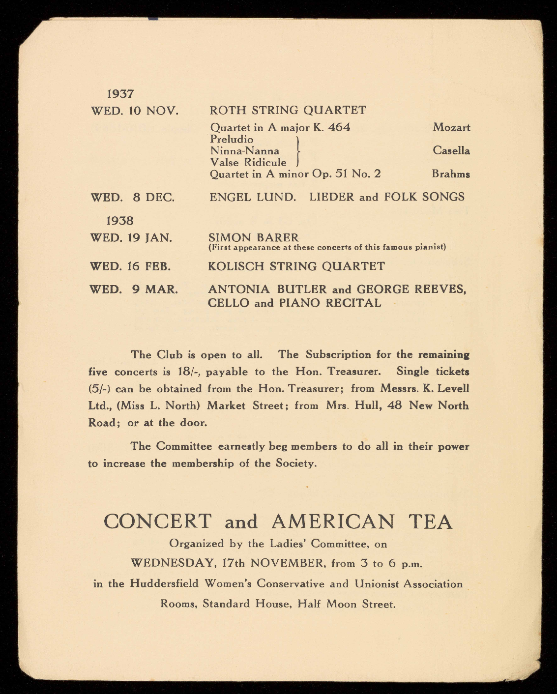 the series, of SIX CONCERTS is 21/- payable to the Hon.