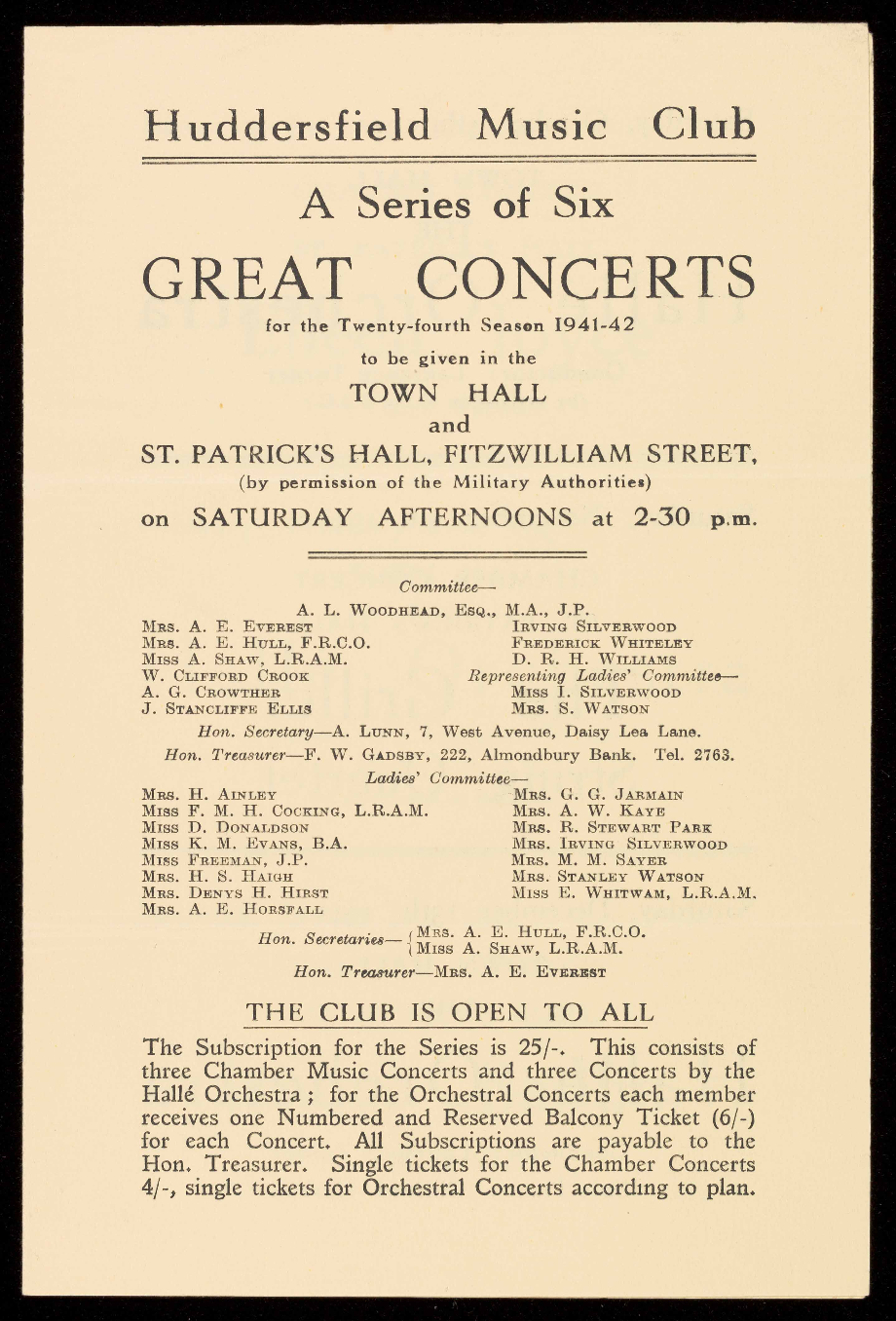 Hon. Treasurer-F. W. GADSBY, 222, Almondbury Bank. Tel. 2763.