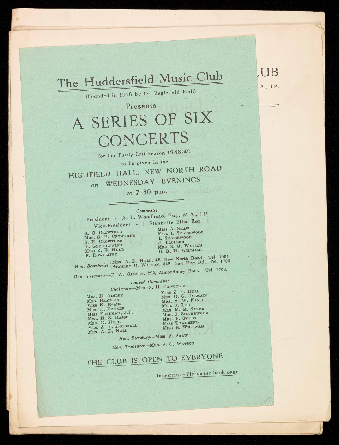 Hon. Treasurer-F. W. GADSBY, 222, Almondbury Bank. Tel. 2763.