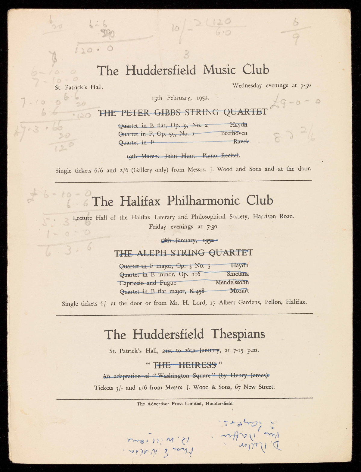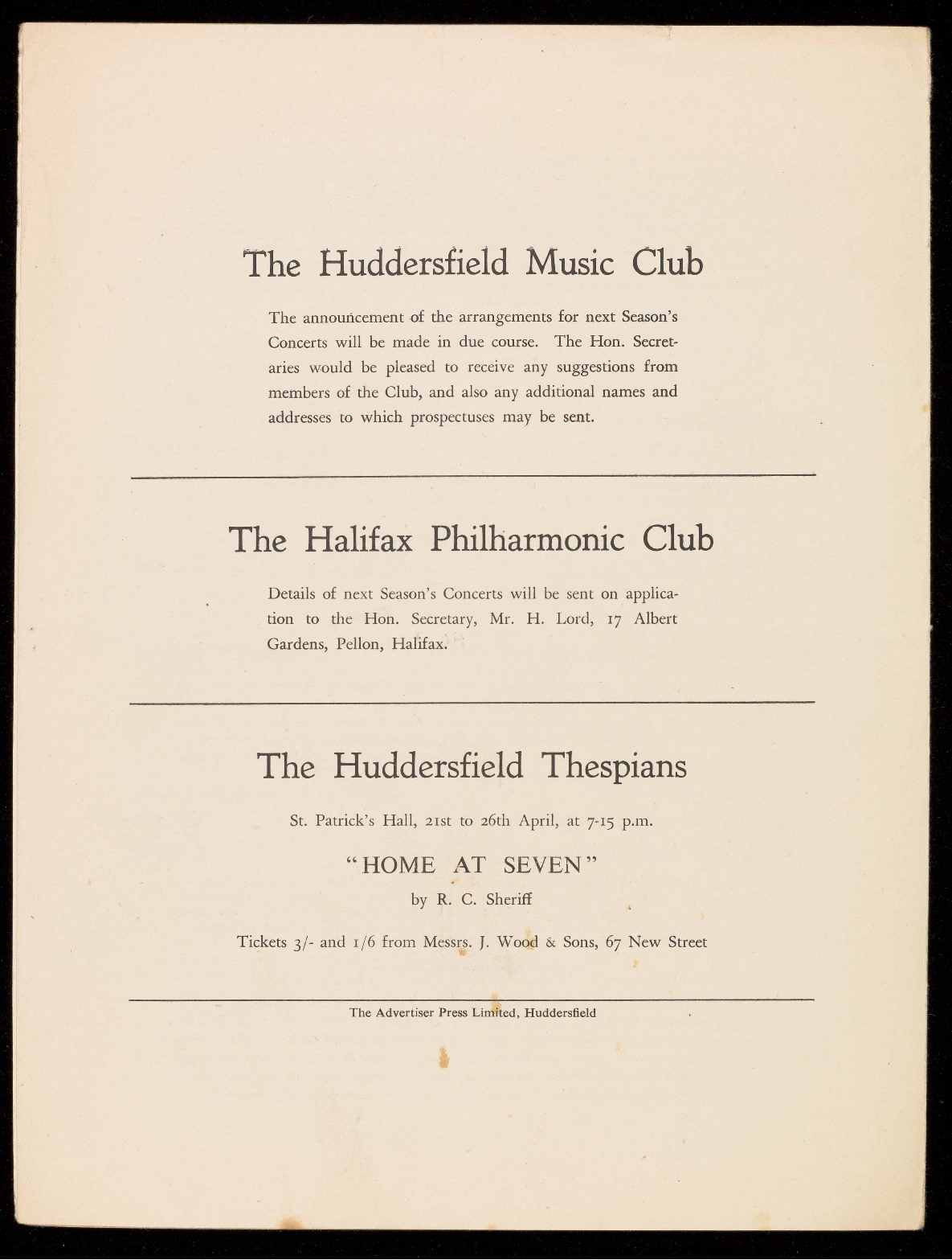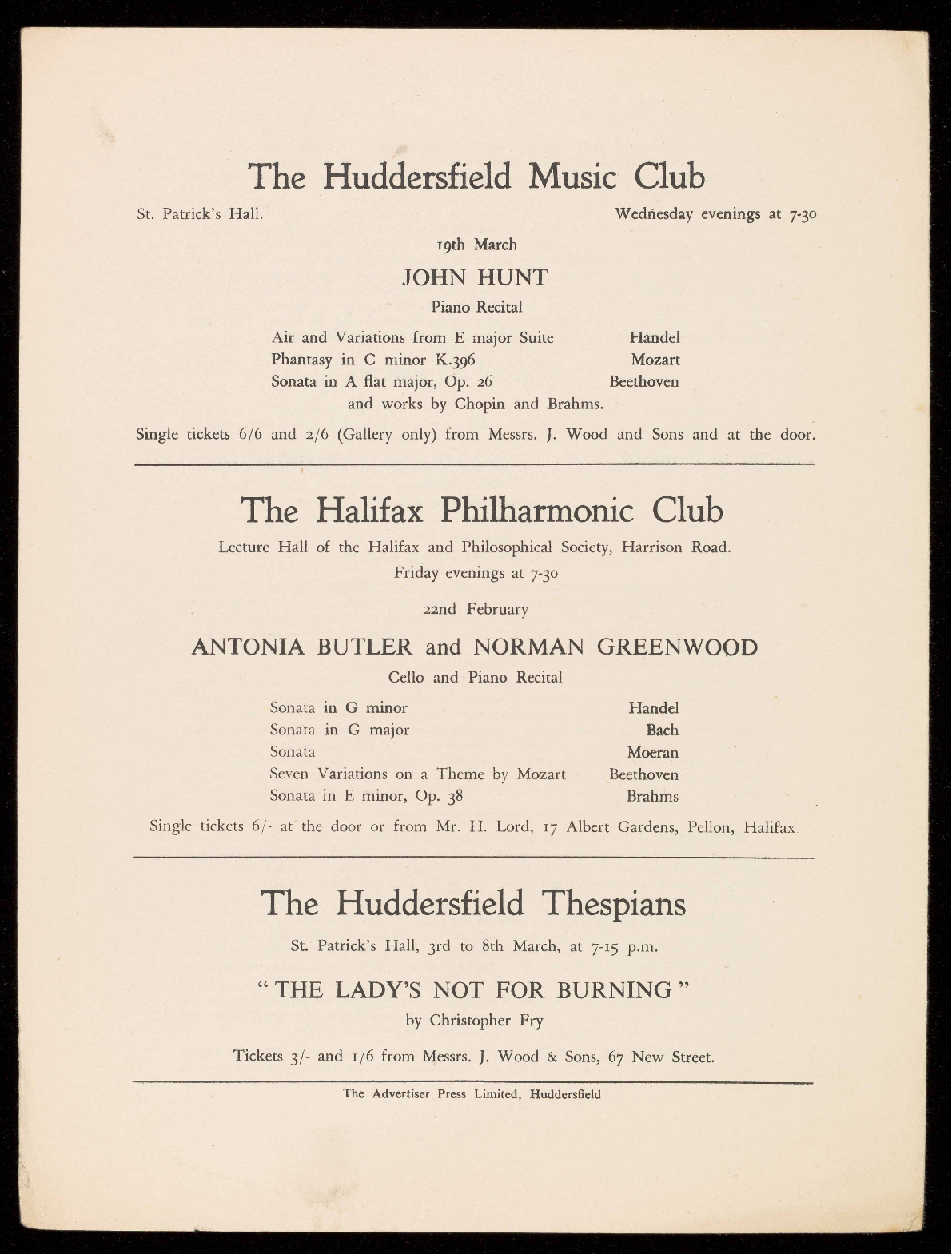 Tickets 3/- and 1/6 from Messrs. J. Wood & Sons, 67 New Street