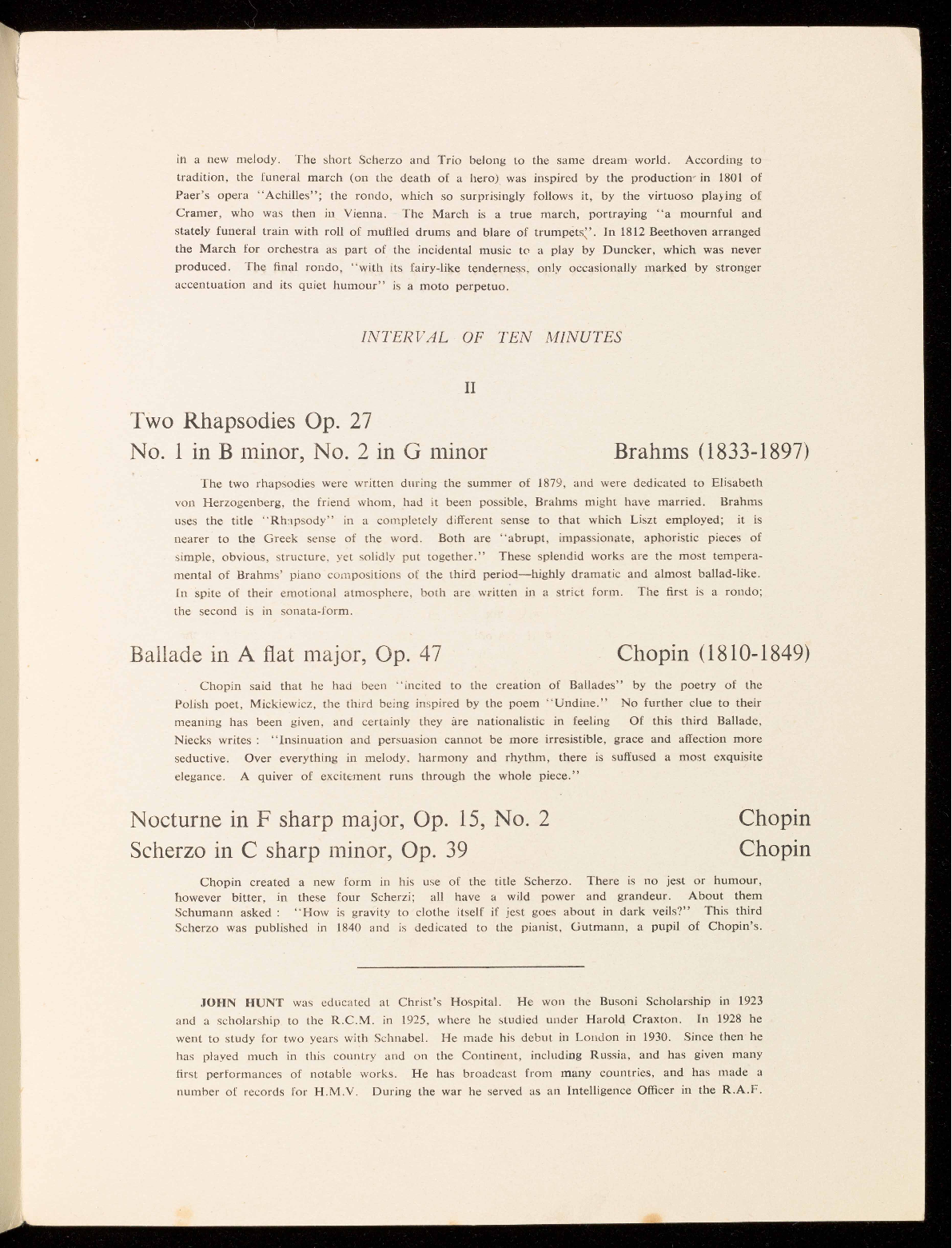 JOHN HUNT was educated at Christ's Hospital. He won the Busoni Scholarship in 1923