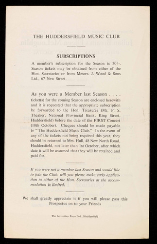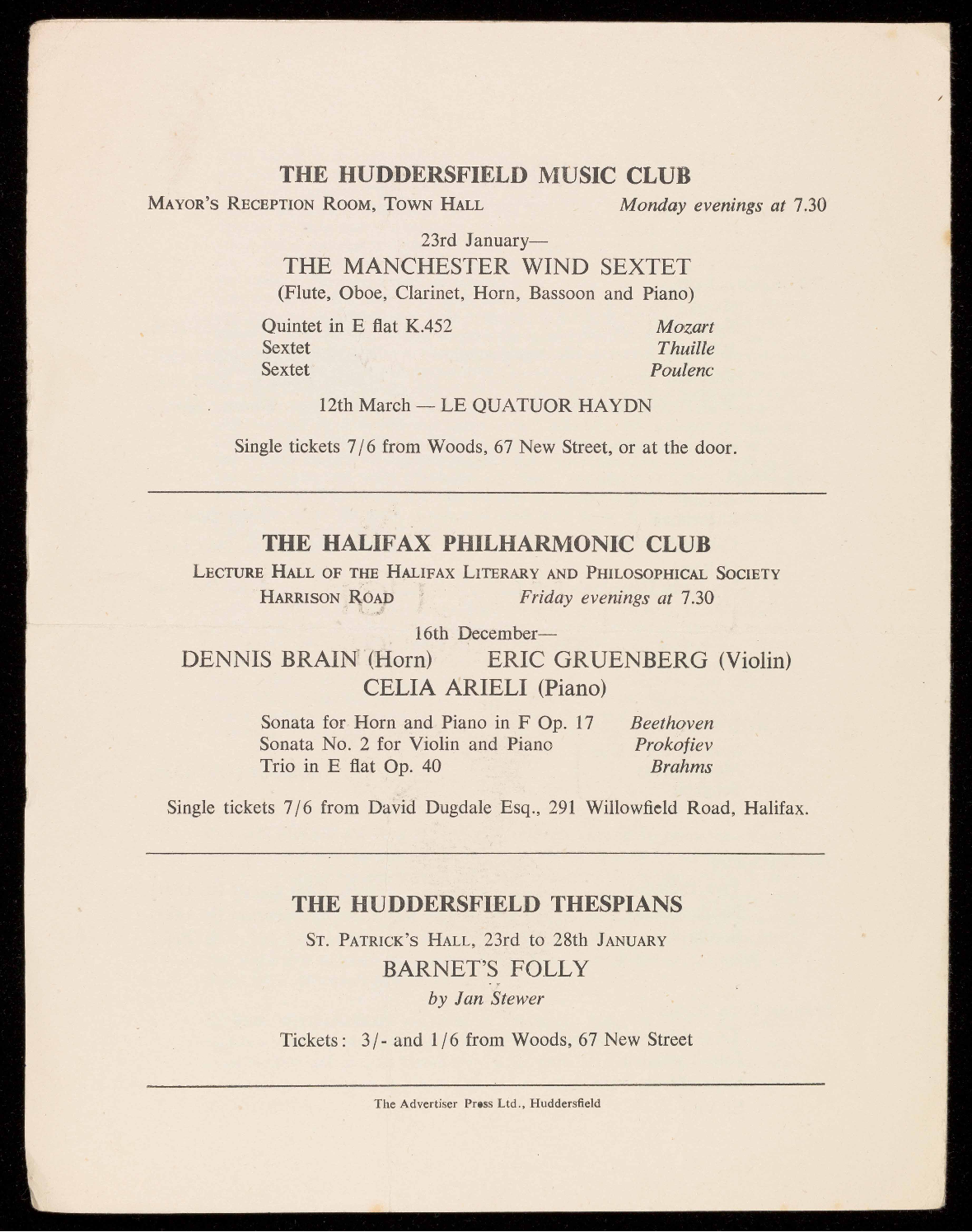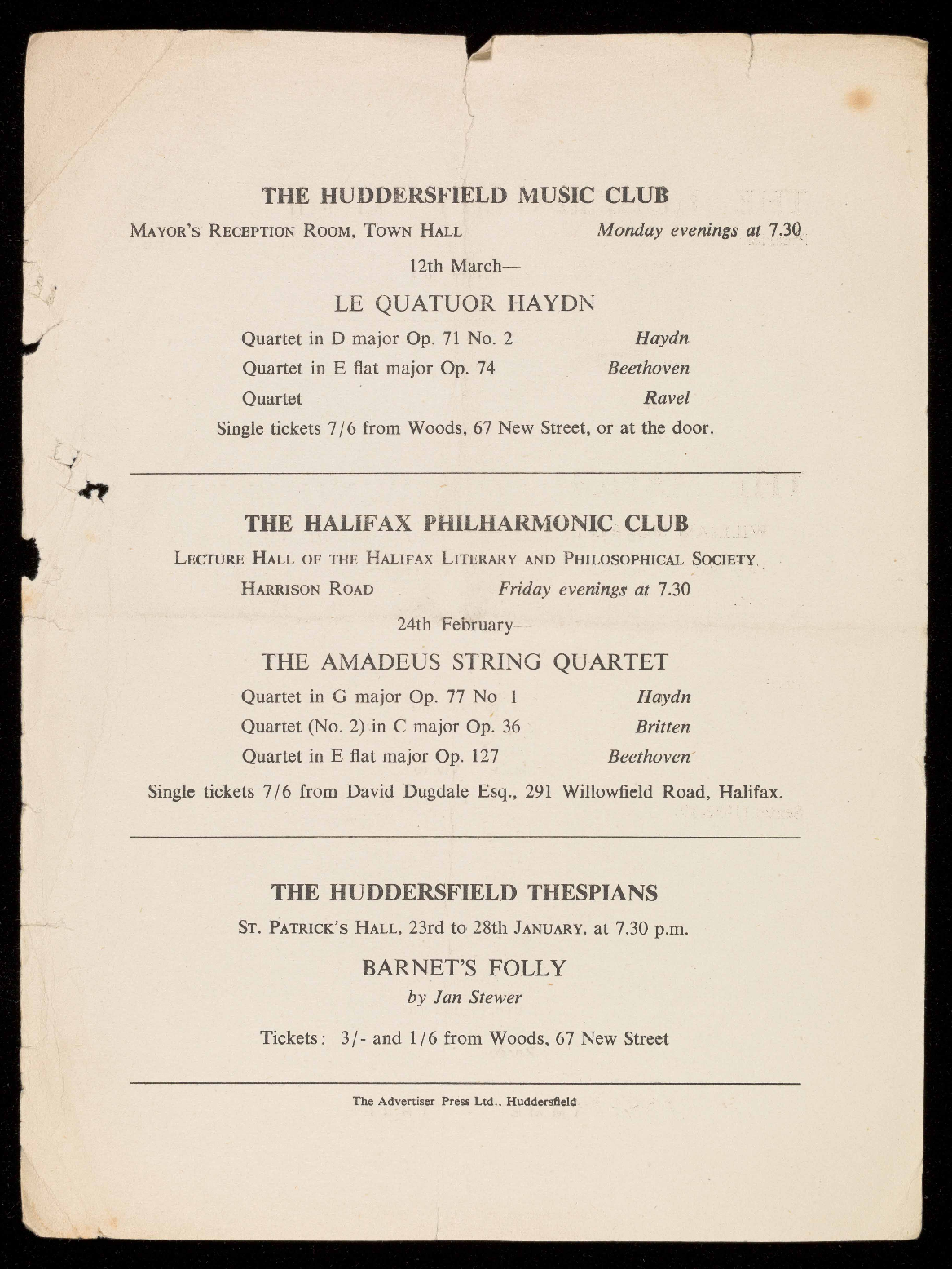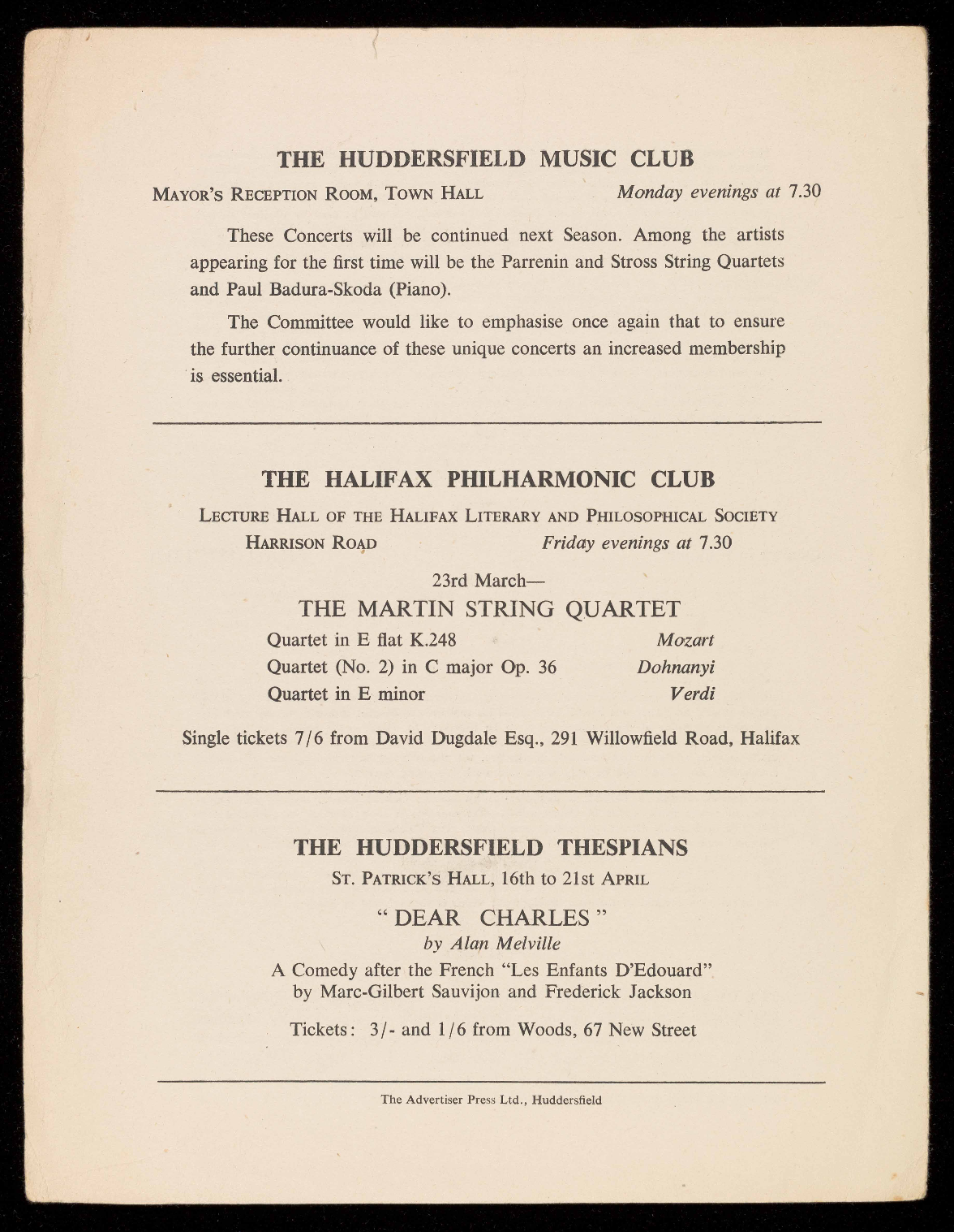 Single tickets 7/6 from David Dugdale Esq., 291 Willowfield Road, Halifax