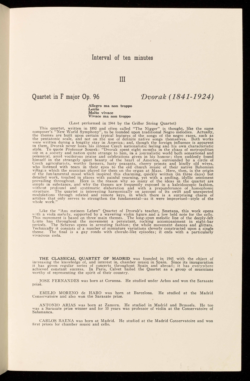 tonight is his only string quartet. (The quartet "La Oracion del Torero" being originally