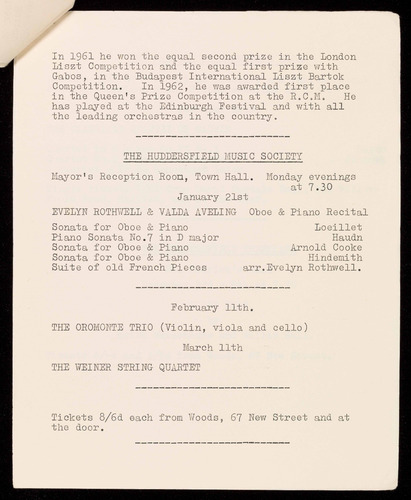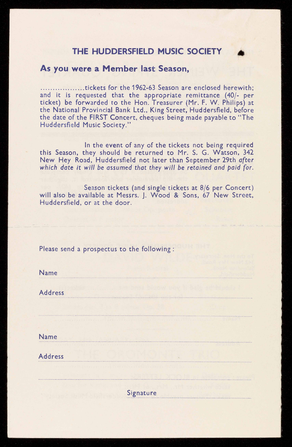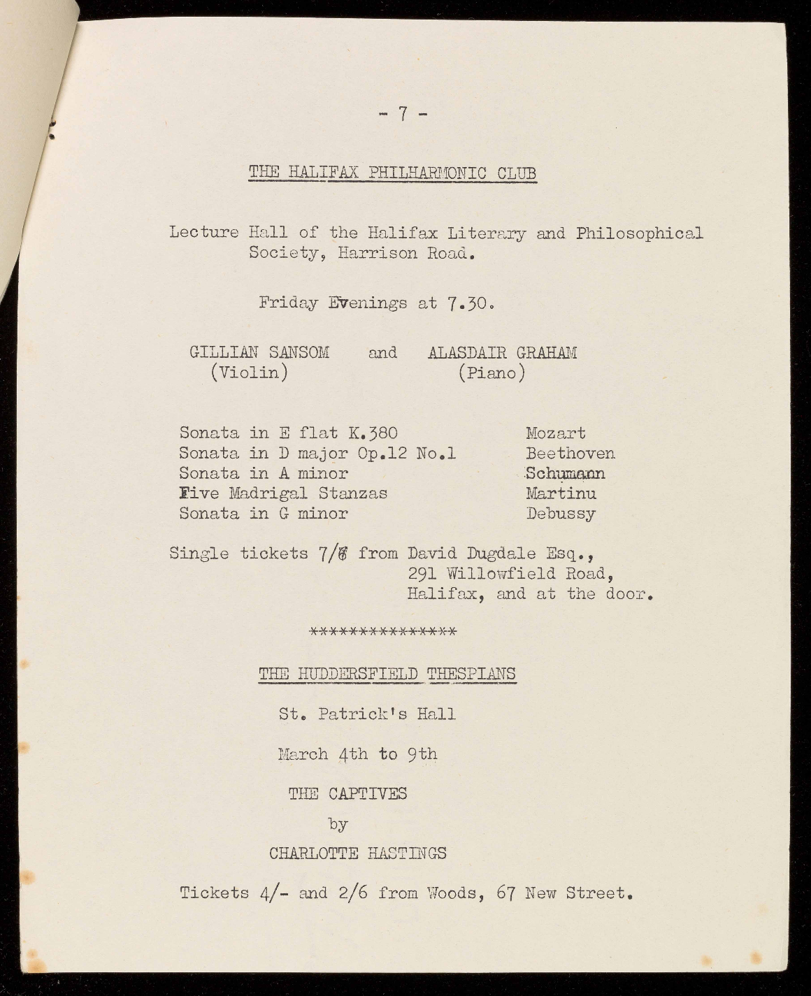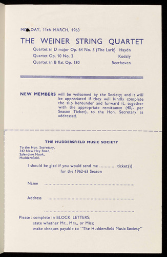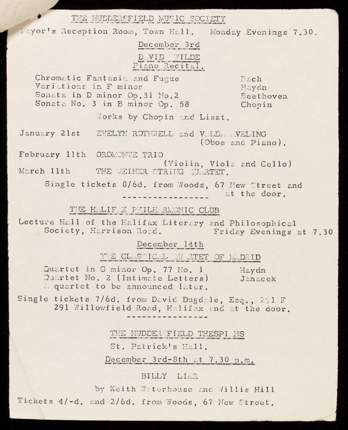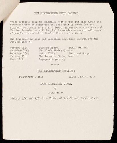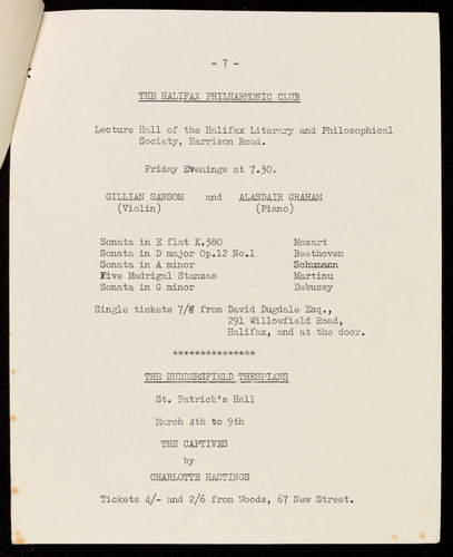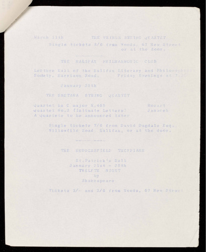Tickets 4/-d and 2/6d from Woods, 67 New Street, Huddersfield.