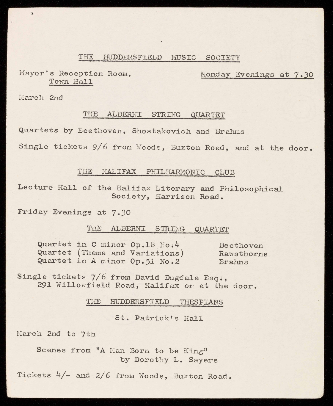 Tickets 4/6 and 2/6 from Woods, Buxton Road.