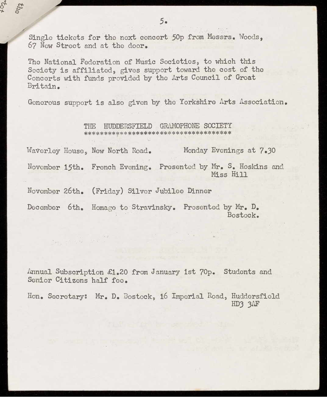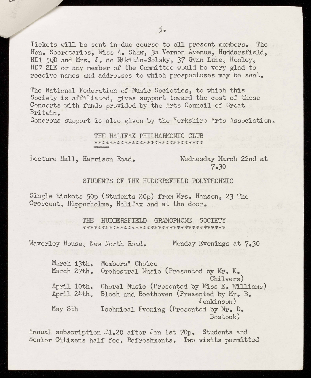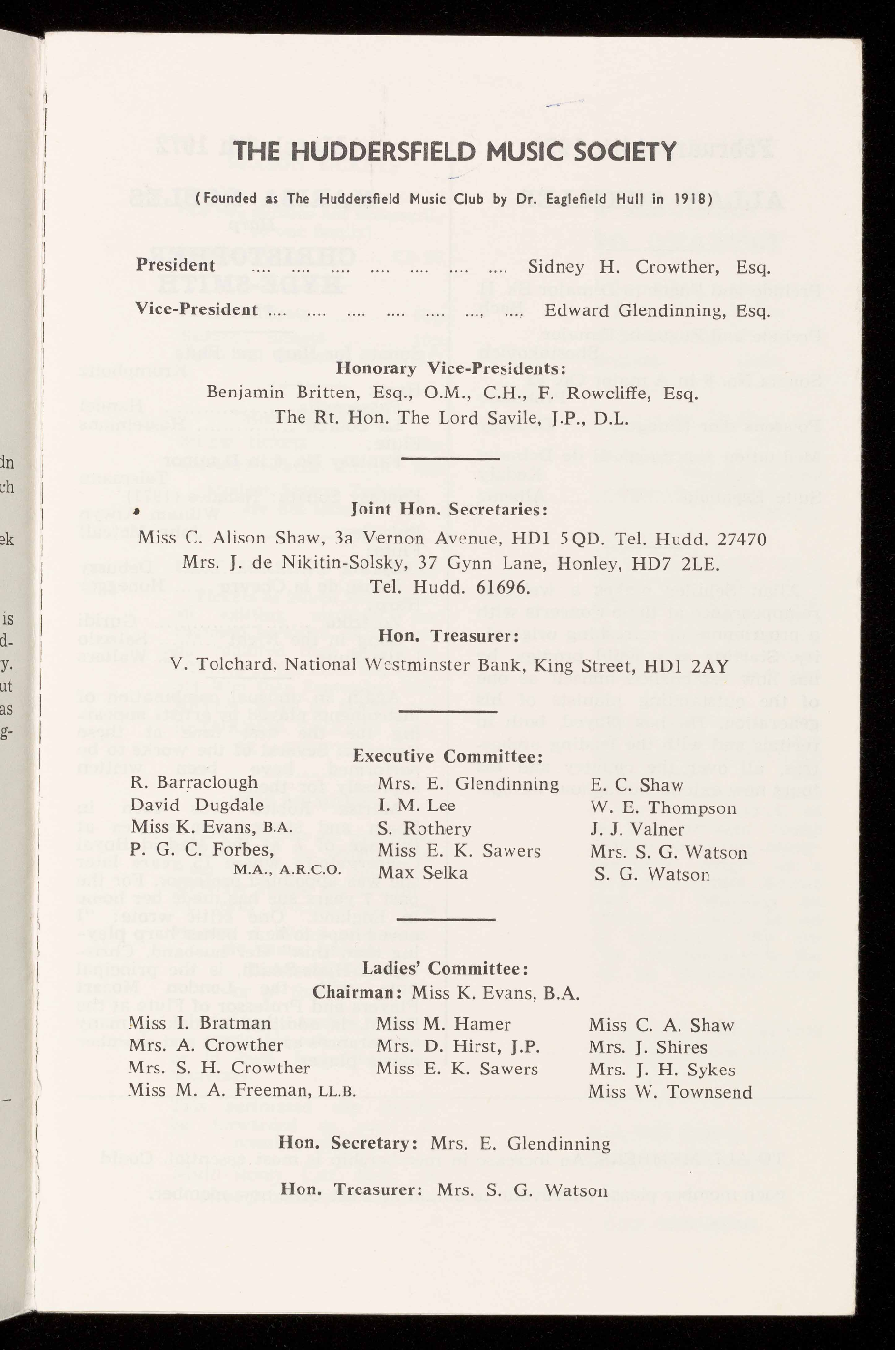 Hon. Secretaries, Miss A. Shaw, 3a Vernon Avenue, Huddersfield,