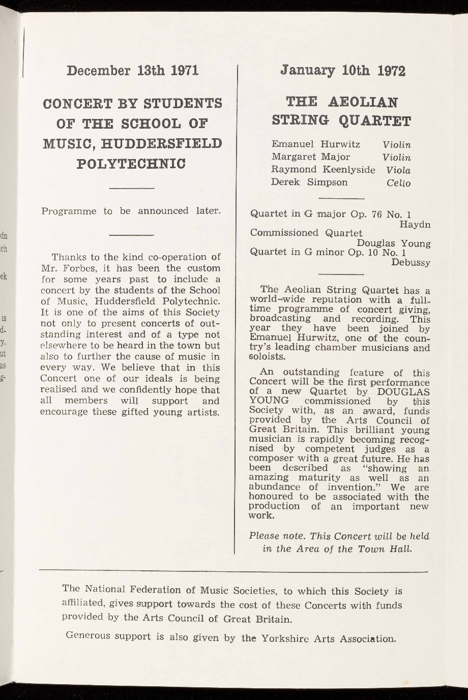 Concerts with funds provided by the Arts Council of Great