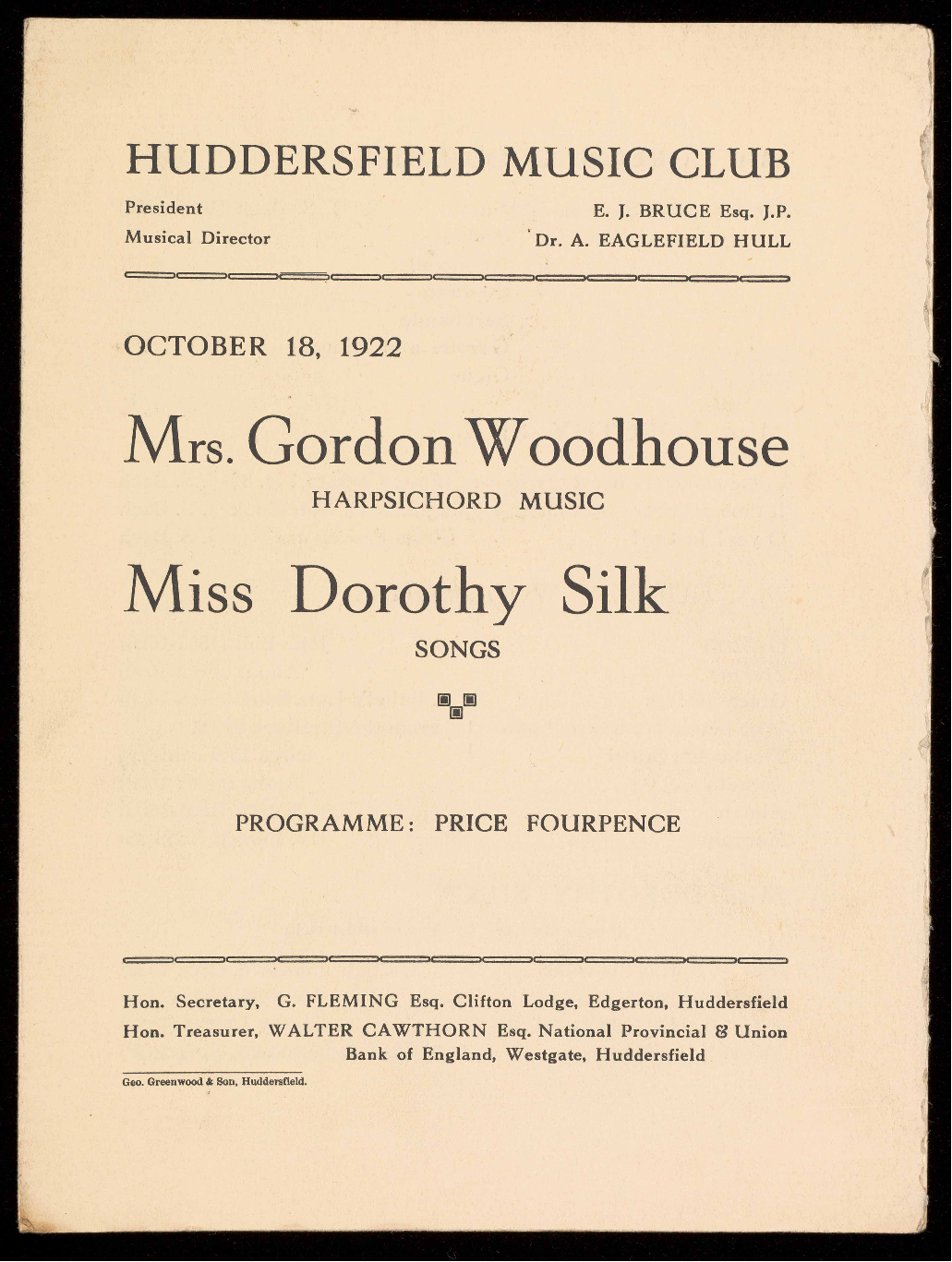 Hon. Secretary, G. FLEMING Esq. Clifton Lodge, Edgerton, Huddersfield