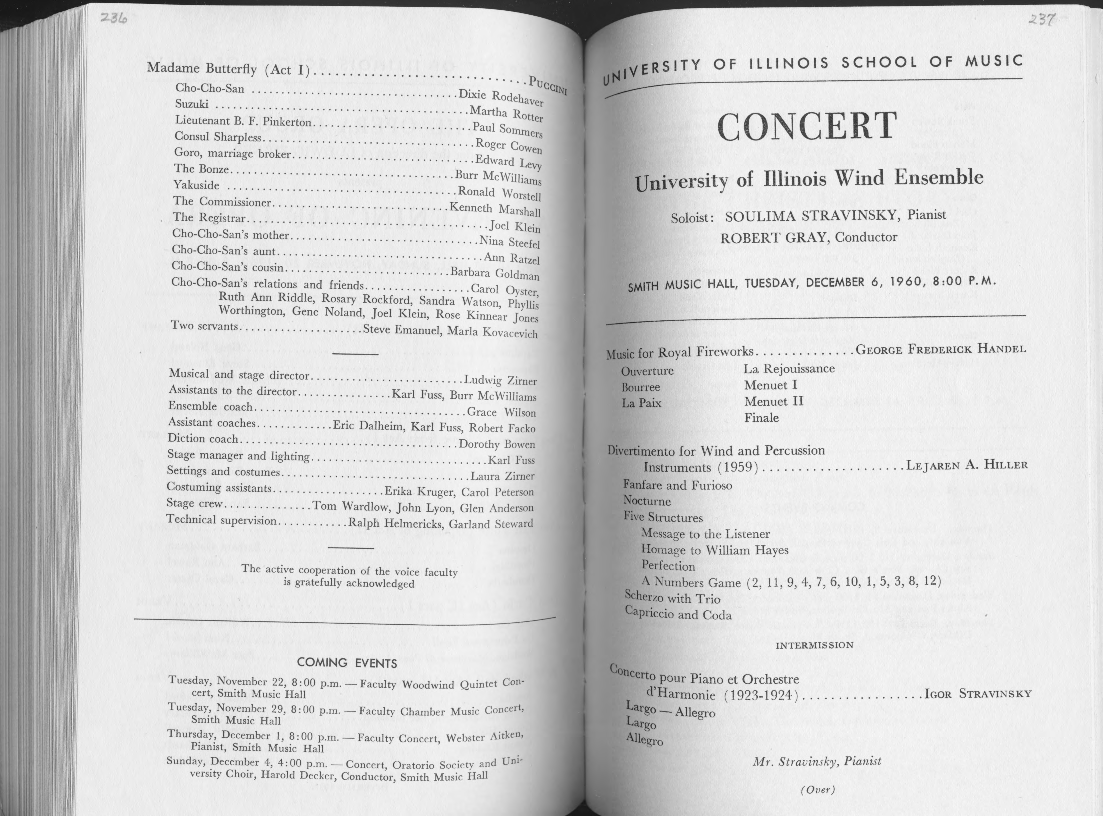 I ·11 Iii 11 ~ Madame Butterfly ( Act I ) . . . . . . . . . . . . . . . . . . . . . . . . . . . . . p . . • Dec,~, Cho-Cho-San •••••••••• . ... . ........ . • .. • • • • • • • • D1x1e Rodehaver Suzuki • •••••••••• •• •••....... . ...... • • . • • • • • • • • • . Martha Rotter Lieutenant B. F. Pinkerton •.................... • • .••.Paul Sornrners Consul Sharpless ••••••••.......... • .. • • • • • • • • • • • • • • • Roger Cowen Goro, marriage broker ••................. • ... • • . • • ... Edward Levy The Bonze •••••••••••••••........ . • ... • . •.• .. ••.Burr McWilliams Yakuside •• • • •••••••••... .. . .. ........ . • ... • .... Ronald Worstell The Commissioner ••••..................... • .. • . Kenneth Marshall The Registrar ••••••••••...... • . • • • • • • • • • • • • • • • • • • • • • • . Joe! Klein Cho-Cho-San's mother •.••.............. .. ... .. ....... Nina Steefel Cho-Cho-San's aunt ••••...... • .... • • . • • . • • • • • • • • • • • • • . Ann Ratzel Cho-Cho-San's cousin •........................... Barbara Goldman Cho-Cho-San's relations and friends .................. Carol Oyster, Ruth Ann Riddle, Rosary Rockford, Sandra Watson, Phyllis Worthington, Gene Noland, Joel Klein, Rose Kinnear Jones Two servants •••••••••••.......... Steve Emanuel, Marla Kovacevich Musical and stage director .......................... Ludwig Zirner Assistants to the director .. . . . ........... Karl Fuss, Burr Mc Williams Ensemble coach •••••............................... Grace Wilson Assistant coaches •••.......... Eric Dalheim, Karl Fuss, Robert Facko Diction coach ••• ••............ ......... ... .... .... Dorothy Bowen Stage manager and lighting ........... . ....... ... ........ Karl Fuss Settings and costumes . ... . ...... ... .... .... ..... .. ... Laura Zirner Costuming assistants .... .... ........... Erika Kruger, Carol Peterson Stage crew ••••••••....... Tom Wardlow, John Lyon, Glen Anderson Technical supervision ......... . .. Ralph Helmericks, Garland Steward The active cooperation of the voice faculty is gratefully acknowledged COMING EVENTS Tuesday, November 22, 8: 00 p.m. - Faculty Woodwind Quintet Con- cert, Smith Music Hall Tuesday, November 29, 8:00 p.m. - Faculty Chamber Music Concert, Smith Music Hall Thursday, December 1, 8: 00 p.m. - Faculty Concert, Webster 1 ' A'tken Pianist, Smith Music Hall . d Un1-Sunday, December 4, 4: 00 p.m. - Concert, Oratorio Society an versity Choir, Harold Decker, Conductor, Smith Music Hall OF ILLINOIS SCHOOL OF MUSIC CONCERT University of Illinois Wind Ensemble Soloist: SOULIMA STRAVINSKY, Pianist ROBERT GRAY, Conductor SMITH MUSIC HALL, TUESDAY, DECEMBER 6, 1960, 8 :00 P. M. Music for Royal Fireworks ........ ..... . GEORGE FREDERICK HANDEL Ouverture Bounee La Paix La Rejouissance Menuet I Menuet II Finale Divertimento for Wind and Percussion Instruments ( 1959) .................... LEJ AREN A. HILLER Fanfare and Furioso Nocturne Five Structures Message to the Listener Homage to William Hayes Perfection A Numbers Game Scherzo with Trio Capriccio and Coda (2, 11, 9, 4, 7, 6, 10, 1, 5, 3, 8, 12 ) INTERMISSION Concerto pour Piano et Orchestre L d'Harmonie ( 1923-1924 ) ......... .. .... .. fooR argo - Allegro Largo Allegro Mr. Stravinsky, Pianist ( Over) STRAVINSKY