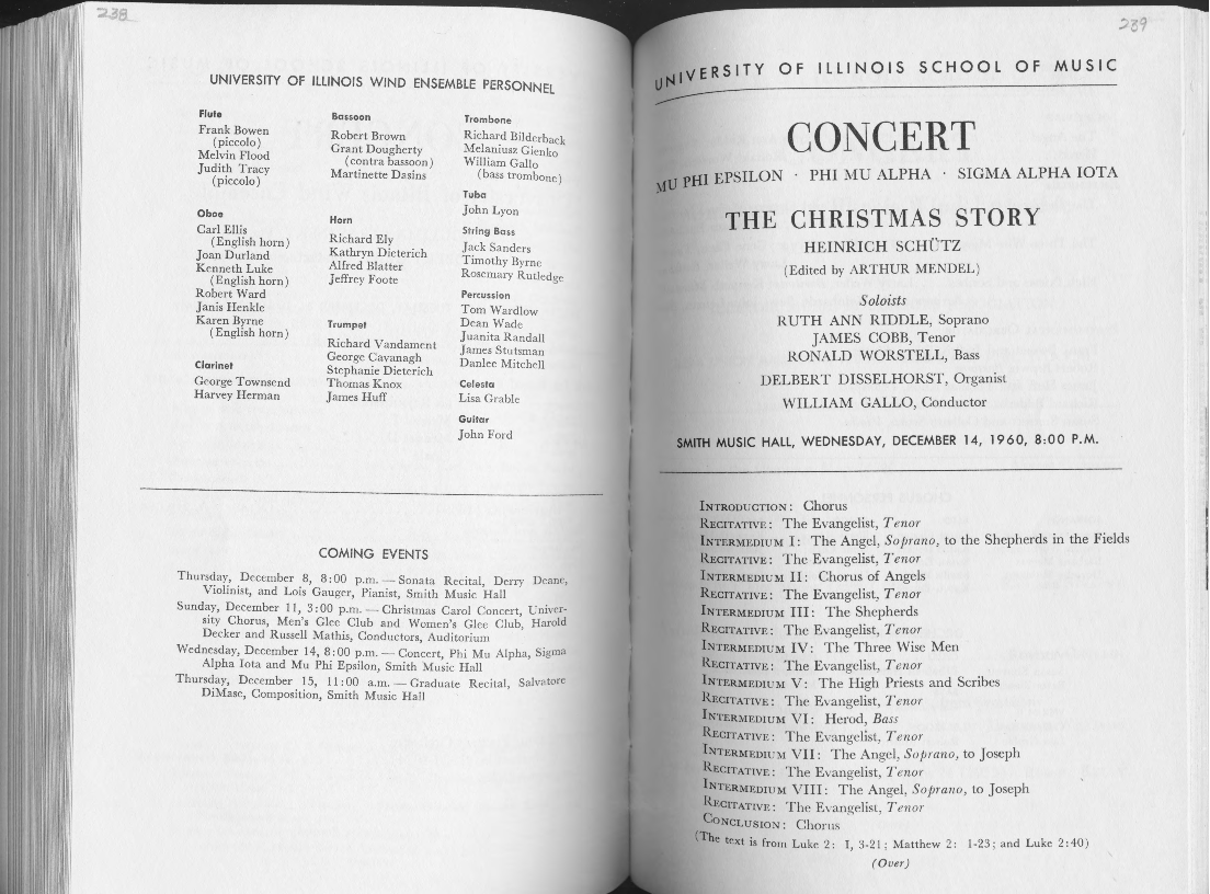 UNIVERSITY OF ILLINOIS WIND ENSEMBLE PERSONNEL Flute Bassoon Trombone Frank Bowen Robert Brown Richard Bilderback (piccolo) Grant Dougherty Melaniusz Gienko Melvin Flood (contra bassoon ) William Gallo Judith Tracy Martinette Dasins ( bass trombone) (piccolo) Tuba Oboe John Lyon Horn Carl Ellis String Bass (English horn) Richard Ely Jack Sanders Joan Durland Kathryn Dieterich Timothy Byrne Kenneth Luke Alfred Blatter Rosemary Rutledge ( English horn ) Jeffrey Foote Robert Ward Percussion Janis Henkle Tom Wardlow Karen Byrne Trumpet Dean Wade ( English horn ) Richard Vandament Juanita Randall James Stutsman George Cavanagh Danlee Mitchell Clarinet Stephanie Dieterich George Townsend Thomas Knox Celesta Harvey Herman James Huff Lisa Grable Guitar John Ford COMING EVENTS Thursday, December 8, 8: 00 p.m. - Sonata Recital, Derry Deane, Violinist, and Lois Gauger, Pianist, Smith Music Hall Sunday, December 11, 3: 00 p.m. - Christmas Carol Concert, Univer- sity Chorus, Men's Glee Club and Women's Glee Club, Harold Decker and Russell Mathis, Conductors, Auditorium Wednesday, December 14, 8:00 p.m. - Concert, Phi Mu Alpha, Sigma Alpha Iota and Mu Phi Epsilon, Smith Music Hall Thursday, December 15, 11 : 00 a.m. - Graduate Recital, Salvatore DiMase, Composition, Smith Music Hall lJNIVERSITY OF ILLINOIS SCHOOL OF MUSIC CONCERT MV pHI EPSILON • PHI MU ALPHA • SIGMA ALPHA IOTA THE CHRISTMAS STORY HEINRICH SCHUTZ (Edited by ARTHUR MENDEL ) Soloists RUTH ANN RIDDLE, Soprano JAMES COBB, Tenor RONALD WORSTELL, Bass DELBERT DISSELHORST, Organist WILLIAM GALLO, Conductor SMITH MUSIC HALL, WEDNESDAY, DECEMBER 14, 1960, 8:00 P.M. INTRODUCTION: Chorus RECITATIVE: The Evangelist, Tenor INTERMEDIUl\\I I: The Angel, Soprano, to the Shepherds in the Fields RECITATIVE: The Evangelist, Tenor INTERMEDIUM II: Chorus of Angels RECITATIVE: The Evangelist, T enor INTERMEDIUM III: The Shepherds RECITATIVE: The Evangelist, Tenor INTERMEDIUM IV: The Three Wise Men RECITATivi,:: The Evangelist, T enor lNTERMEDIUM V: The High Priests and Scribes RECITATIVE: The Evangelist, Tenor lNTERMEDIUM VI: Herod, Bass RECITATIVE: The Evangelist, T enor lNTERMEDIUl\\I VII: The Angel, Soprano, to Joseph RECITATIVE: The Evangelist, T enor lr-.TERMEDIUM VIII: The Angel, Soprano, to Joseph RFc • ITATIVE: The Evangelist, T e11or CoNcLusroN: Chorus (l'he text is from Luke 2: I, 3-21 ; Matthew 2: 1-23 ; and Luke 2: 40 ) (Over) lj