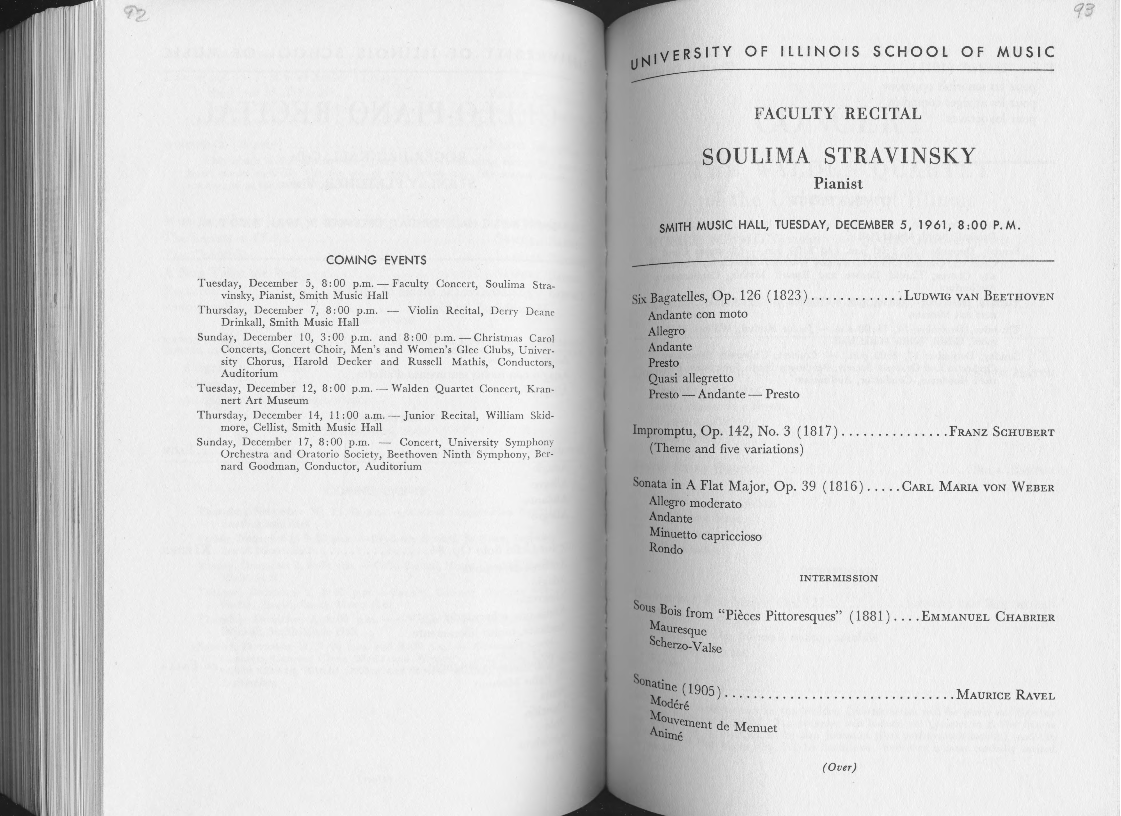 COMING EVENTS Tuesday, December 5, 8: 00 p.m. - Faculty Concert, Soulima Stra- vinsky, Pianist, Smith Music Hall Thursday, December 7, 8: 00 p.m. - Violin Recital, Derry Deane Drinkall, Smith Music Hall Sunday, December 10, 3: 00 p.m. and 8: 00 p.m. - Christmas Carol Concerts, Concert Choir, Men's and Women's Glee Clubs, UniYcr• sity Chorus, Harold Decker and Russell Mathis, Conductors, Auditorium Tuesday, December 12, 8:00 p.m. - Walden Quartet Concert, Kran- nert Art Museum Thursday, December 14, 11: 00 a.m. - Junior Recital, William Skid- more, Cellist, Smith Music Hall Sunday, December 17, 8: 00 p.m. - Concert, University Symphony Orchestra and Oratorio Society, Beethoven Ninth Symphony, Ber• nard Goodman, Conductor, Auditorium UNIVERSITY OF ILLINOIS SCHOOL OF MUSIC FACULTY RECITAL SOULIMA STRAVINSKY Pianist SMITH MUSIC HALL, TUESDAY, DECEMBER 5, 1961, 8 :00 P. M. Six Bagatelles, Op. 126 ( 1823) ............. Lunwm VAN BEETHOVEN Andante con moto Allegro Andante Presto Quasi allegretto Presto - Andante - Presto Impromptu, Op. 142, No. 3 ( 1817) ............... FRANZ SCHUBERT (Theme and five variations) Sonata in A Flat Major, Op. 39 (1816) ..... CARL MARIA VON WEBER Allegro moderato Andante Minuetto capriccioso Rondo INTERMISSION Sous Bois from "Pieces Pittoresques" ( 1881) .... EMMANUEL CHABRIER Mauresque Scherzo-Va!se So~tine ( 1905) ................................ MAURICE RAVEL odere Afouvern ltnizne ent de Menuet (Over)