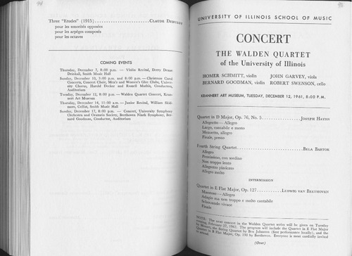 Three "Etudes" ( 1915) ........................ CLAUDE DEBDssv pour les sonorites opposees pour les arpeges composes pour les octaves COMING EVENTS Thursday, December 7, 8: 00 p.m. - Violin Recital, Derry Deane Drinkall, Smith Music Hall Sunday, December 10, 3: 00 p.m. and 8: 00 p.m. - Christmas Carol Concerts, Concert Choir, Men's and Women's Glee Clubs, Univer- sity Chorus, Harold Decker and Russell Mathis, Conductors, Auditorium Tuesday, December 12, 8:00 p.m. - Walden Quartet Concert, Kran- nert Art Museum Thursday, December 14, 11: 00 a.m. - Junior Recital, William Skid- more, Cellist, Smith Music Hall Sunday, December 17, 8: 00 p.m. - Concert, University Symphony Orchestra and Oratorio Society, Beethoven Ninth Symphony, Ber- nard Goodman, Conductor, Auditorium UNIVERSIT Y OF ILLINOIS SCHOOL OF MUSIC CONCERT TH E WALDEN QUARTET of the University of Illinois HOMER SCHMITT, violin JOHN GARVEY, viola BERNARD GOODMAN, violin ROBERT SWENSON, cello KRANNERT ART MUSEUM, TUESDAY, DECEMBER 12, 19 61, 8: 0 O P. M. Quartet in D Major, Op. 76, No. 5 ................. JOSEPH HAYDN Allegretto - Allegro Largo, cantabile e mesto Menuetto, allegro Finale, presto Fourth String Quartet ............................. BELA BAR TOK Allegro Prestissimo, con sordino Non troppo lento Allegretto pizzicato Allegro molto INTERMISSION Quartet in E Fl t ~1 • O 127 L B a l \\ aJor, p. . . . . . . . . . . . UDWIG VAN EETHOVEN Maestoso \_ Allegro A~~om · Sch a non troppo e molto cantabile F. erzando vivace Inale =------tfo-r2: T ------------------- ~g, Fe~e next concert in the Walden Quartet series will be given on Tuesday o..,\_\_ lroZart, t~~a;y ~7, 1962. The program will include the Quartet in E Flat Major ~ t in B Fi tnng \_Quartet by Ben Johnston (first performance locally), and the lttenct. at MaJor, Op. 130 by Beethoven. Everyone is most cordially invited (Over) ?-