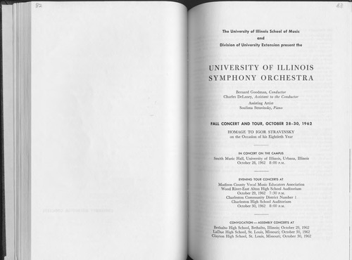 The University of Illinois School of Music and Division of University Extension present the UNIVERSITY OF ILLINOIS SYMPHONY ORCHESTRA Bernard Goodman, Conductor Charles DeLaney, Assistant to the Conductor Assisting Artist- Soulima Stravinsky, Piano FALL CONCERT AND TOUR, OCTOBER 28-30, 1962 HOMAGE TO IGOR STRAVINSKY on the Occasion of his Eightieth Year IN CONCERT ON THE CAMPUS Smith Music Hall, University of Illinois, Urbana, Illinois October 28, 1962 8:00 P.M. EVENING TOUR CONCERTS AT Madison County Vocal Music Educators Association Wood River-East Alton High School Auditorium October 29, 1962 7: 30 P.M. Charleston Community District Number 1 Charleston High School Auditorium October 30, 1962 8:00 P.M. CONVOCATION - ASSEMBLY CONCERTS AT Bethalto High School, Bethalto, Illinois; October 29, 1962 LaDue High School, St. Louis, Missouri; October 30, 1962 Clayton High School, St. Louis, Missouri; October 30, 1962