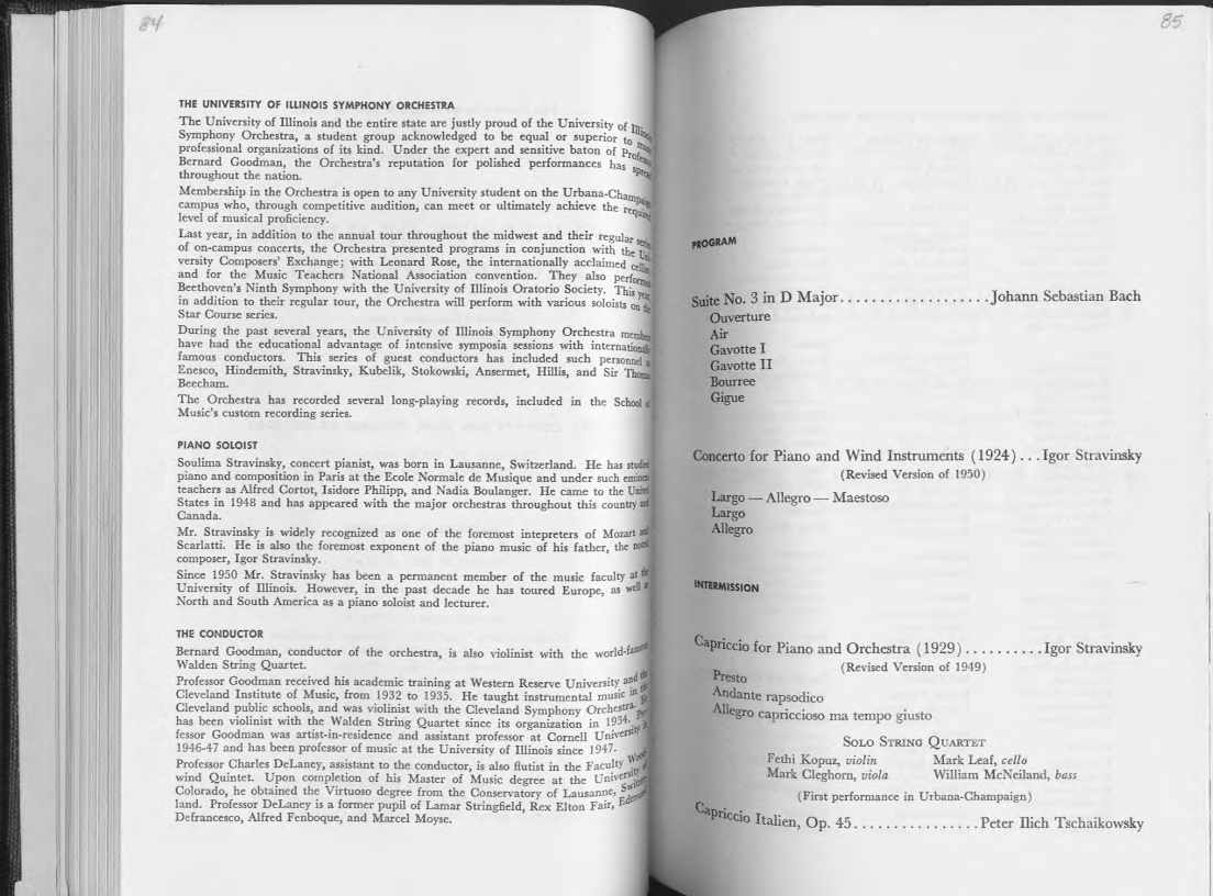 THE UNIVERSITY OF ILLINOIS SYMPHONY ORCHESTRA The University of Illinois and the entire state are justly proud of the University of 111. Symphony Orchestra, a student group acknowledged to be equal or superior to 1~ professional organizations of its kind. Under the expert and sensitive baton of Pro(~ Bernard Goodman, the Orchestra's reputation for polished performances has s e~ throughout the nation. p~ Membership in the Orchestra is open to any University student on the Urbana-Chclll:lp. campus who, through competitive audition, can meet or ultimately achieve the req ~!I level of musical proficiency. ulr!c Last year, in addition to the annual tour throughout the midwest and their regulars . of on-campus concerts, the Orchestra presented programs in conjunction with the t~ versity Composers' Exchange; with Leonard Rose, the internationally acclaimed cel!'ll). and for the Music Teachers National Association convention. They also perfol'!n~ Beethoven's Ninth Symphony with the University of Illinois Oratorio Society. This ye in addition to their regular tour, the Orchestra will perform with various soloists on: Star Course series. During the past several years, the University of Illinois Symphony Orchestra membai have had the educational advantage of intensive symposia sessions with international!, famous conductors. This series of guest conductors has included such personnel ~ Enesco, Hindemith, Stravinsky, Kubelik, Stokowski, Ansermet, Hillis, and Sir Thoma Beecham. The Orchestra has recorded several long-playing records, included in the School « Music's custom recording series. PIANO SOLOIST Soulima Stravinsky, concert pianist, was born in Lausanne, Switzerland. He has studitd piano and composition in Paris at the Ecole Normale de Musique and under such eminnt teachers as Alfred Cortot, Isidore Philipp, and Nadia Boulanger. He came to the United States in 1948 and has appeared with the major orchestras throughout this country Canada. Mr. Stravinsky is widely recognized as one of the foremost intepreters of Mozart and Scarlatti. He is also the foremost exponent of the piano music of his father, the no composer, Igor Stravinsky. Since 1950 Mr. Stravinsky has been a permanent member of the music faculty at~ University of Illinois. However, in the past decade he has toured Europe, as well North and South America as a piano soloist and lecturer. THE CONDUCTOR Bernard Goodman, conductor of the orchestra, is also violinist with the world-fafll Walden String Quartet. ~ Professor Goodman received his academic training at Western Reserve Universit~ a~d it# Cleveland Institute of Music, from 1932 to 1935. He taught instrumental music lll Cleveland public schools, and was violinist with the Cleveland Symphony Orchestra, 1'I' has been violinist with the Walden String Quartet since its organization in 1?34• ·ty fessor Goodman was artist-in-residence and assistant professor at Cornell Universi 1946-4 7 and has been professor of music at the University of Illinois since 194 7 • W Professor Charles DeLaney, assistant to the conductor, is also flutist in the FacultY 't" wind Quintet. Upon completion of his Master of Music degree at the Unive;s\\· Colorado, he obtained the Virtuoso degree from the Conservatory of Lausan~e, E;ll1 land. Professor DeLaney is a former pupil of Lamar Stringfield, Rex Elton Fair, Defrancesco, Alfred Fenboque, and Marcel Moyse. ptOGRAM Suite No. 3 in D Major ................... Johann Sebastian Bach Ouverture Air Gavotte I Gavotte II Bourree Gigue Concerto for Piano and Wind Instruments ( 1924) ... Igor Stravinsky (Revised Version of 1950) Largo - Allegro - Maestoso Largo Allegro INTERMISSION Ca • • pncc10 for Piano and Orchestra ( 1929) .......... Igor Stravinsky Presto ( Revised Version of 1949) Andante rapsodico Allegro capriccioso ma tempo giusto SOLO STRING QUARTET Fethi Kopuz, violin Mark Leaf, cello Mark Cleghorn, viola William McN eiland, bass (First performance in Urbana-Champaign) Cap· l'lccio Ital' O 45 P Ili h T h .k k 1en, p. . . . . . . . . . . . . . . . . eter c sc a1 ows y