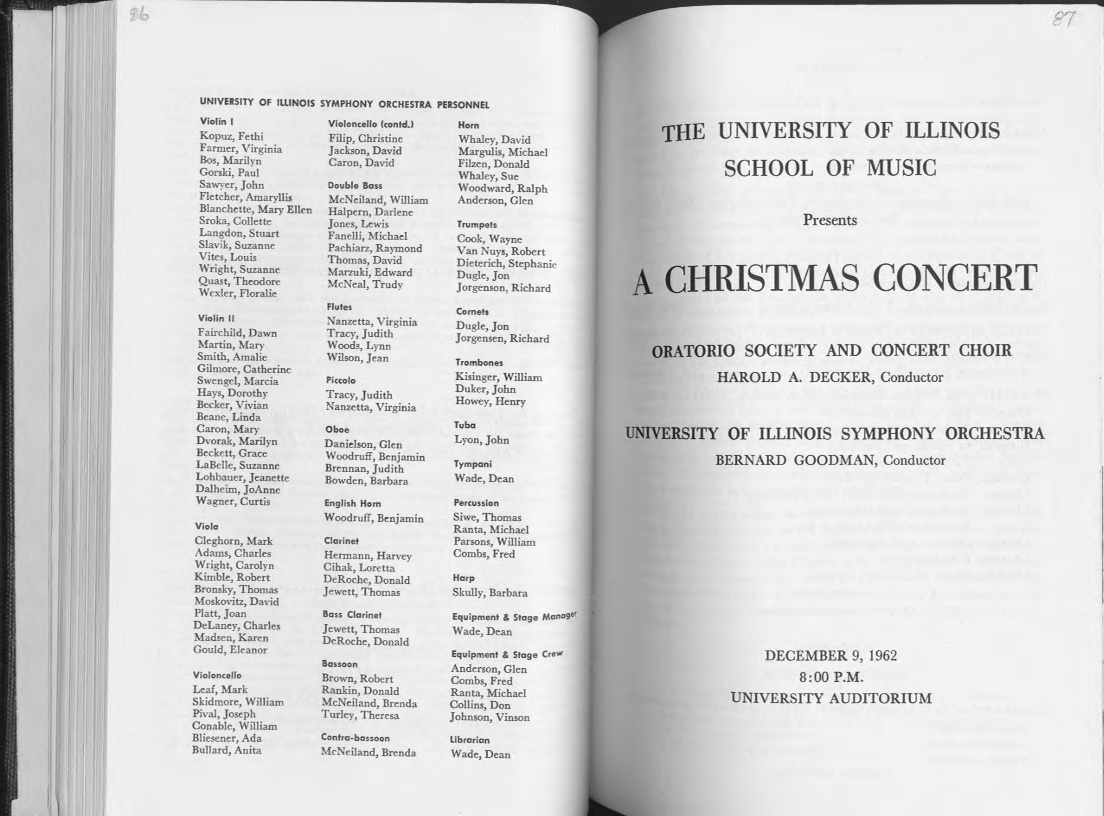 UNIVERSITY OF ILLINOIS SYMPHONY ORCHESTRA PERSONNEL Violin I Violoncello (contd.) Horn Kopuz, Fethi Filip, Christine Whaley, David Farmer, Virginia Jackson, David Margulis, Michael Bos, Marilyn Caron, David Filzen, Donald Gorski, Paul Whaley, Sue Sawyer, John Double Bass Woodward, Ralph Fletcher, Amaryllis McNeiland, William Anderson, Glen Blanchette, Mary Ellen Halpern, Darlene Sroka, Collette Jones, Lewis Trumpets Langdon, Stuart Fanelli, Michael Cook, Wayne Slavik, Suzanne Pachiarz, Raymond Van N uys, Robert Vites, Louis Thomas, David Dieterich, Stephanie Wright, Suzanne Marzuki, Edward Dugle, Jon Quast, Theodore McNeal, Trudy Jorgenson, Richard Wexler, Floralie Flutes Cornets Violin II Nanzetta, Virginia Dugle, Jon Fairchild, Dawn Tracy, Judith Jorgensen, Richard Martin, Mary Woods, Lynn Smith, Amalie Wilson, Jean Trombones Gilmore, Catherine Kisinger, William Swengel, Marcia Piccolo Duker, John Hays, Dorothy Tracy, Judith Howey, Henry Becker, Vivian Nanzetta, Virginia Beane, Linda Tuba Caron, Mary Oboe Lyon,John Dvorak, Marilyn Danielson, Glen Beckett, Grace Woodruff, Benjamin Tympani LaBelle, Suzanne Brennan, Judith Lohbauer, Jeanette Bowden, Barbara Wade, Dean Dalheim, JoAnne Wagner, Curtis English Horn Percussion Woodruff, Benjamin Siwe, Thomas Viola Ranta, Michael Cleghorn, Mark Clarinet Parsons, William Adams, Charles Hermann, Harvey Combs, Fred Wright, Carolyn Cihak, Loretta Harp Kimble, Robert DeRoche, Donald Bronsky, Thomas Jewett, Thomas Skully, Barbara Moskovitz, David Platt, Joan Bass Clarinet Equipment & Stage Manager DeLaney, Charles Jewett, Thomas Wade,Dean Madsen, Karen DeRoche, Donald Gould, Eleanor Equipment & Stage Crew< Bassoon Anderson, Glen Violoncello Brown, Robert Combs, Fred Leaf, Mark Rankin, Donald Ranta, Michael Skidmore, William McNeiland, Brenda Collins, Don Pival, Joseph Turley, Theresa Johnson, Vinson Conable, William Bliesener, Ada Contra-bassoon Librarian Bullard, Anita McNeiland, Brenda Wade, Dean THE UNIVERSITY OF ILLINOIS SCHOOL OF MUSIC Presents A CHRISTMAS CONCERT ORATORIO SOCIETY AND CONCERT CHOIR HAROLD A. DECKER, Conductor UNIVERSITY OF ILLINOIS SYMPHONY ORCHESTRA BERNARD GOODMAN, Conductor DECEMBER 9, 1962 8:00 P.M. UNIVERSITY AUDITORIUM
