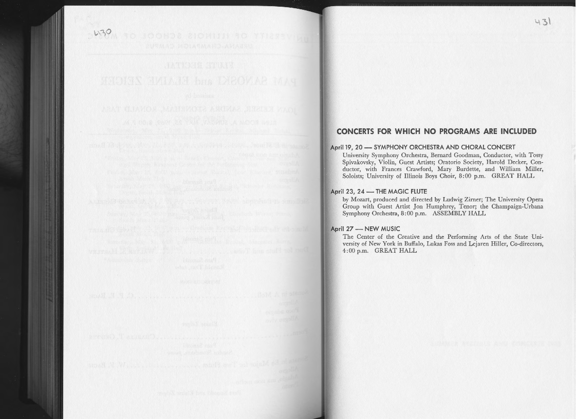 \\...\\1>0 I..\\~\\ CONCERTS FOR WHICH NO PROGRAMS ARE INCLUDED April 19, 20- SYMPHONY ORCHESTRA AND CHORAL CONCERT University Symphony Orchestra, Bernard Goodman, Conductor, with Tossy Spivakovsky, Violin, Guest Artists; Oratorio Society, Harold Decker, Con- ductor, with Frances Crawford, Mary Burdette, and William Miller, Soloists; University of Illinois Boys Choir, 8:00 p.m. GREAT HALL April 23, 24 -THE MAGIC FLUTE by Mozart, produced and directed by Ludwig Zirner; The University Opera Group with Guest Artist Jon Humphrey, Tenor; the Champaign-Urbana Symphony Orchestra, 8: 00 p.m. ASSEMBLY HALL April 27 - NEW MUSIC The Center of the Creative and the Performing Arts of the State Uni- versity of New York in Buffalo, Lukas Foss and Lejaren Hiller, Co-directors, 4: 00 p.m. GREAT HALL